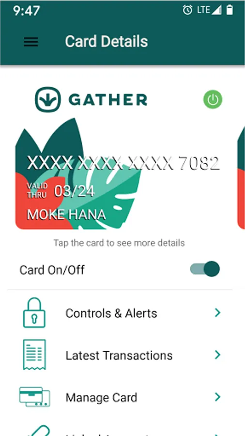Gather CardControl puts you in control of your debit card usage. CardControl helps you protect your debit card by sending you transaction alerts and giving you the ability to define when, where, and how your cards are used. Simply download the Gather CardControl companion app to your smart phone, then customize your alert preferences and usage setting to monitor and manage your cards on Gather Mobile.