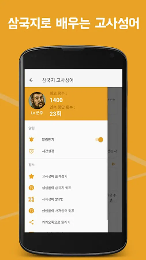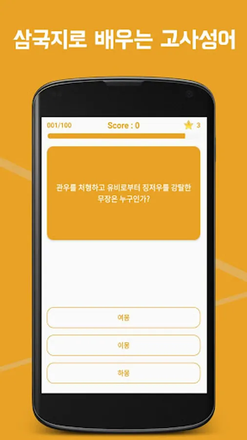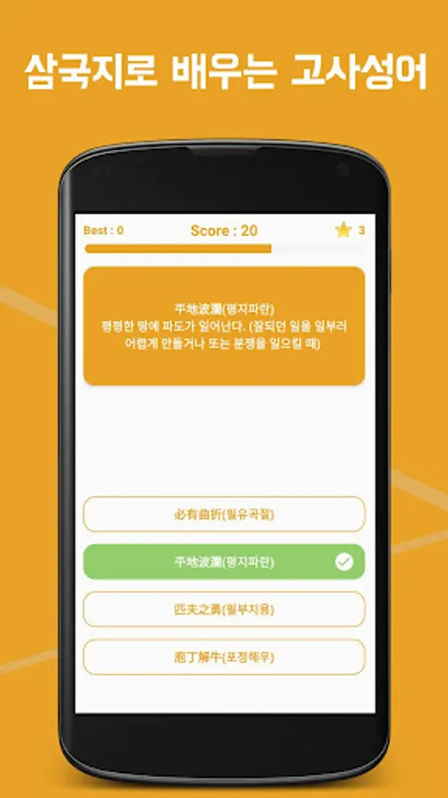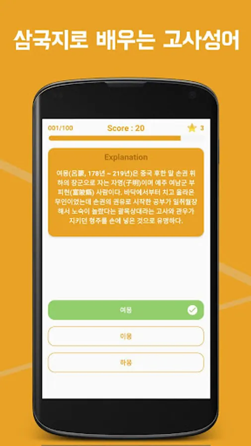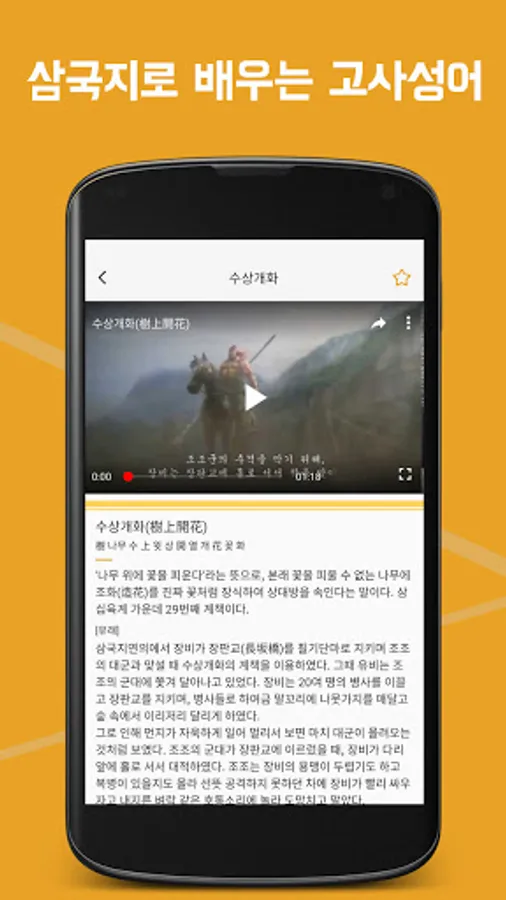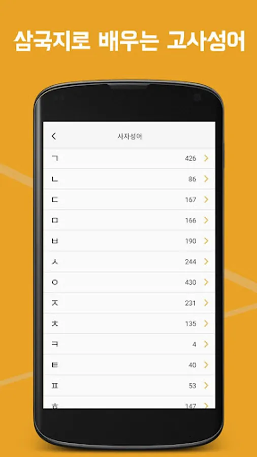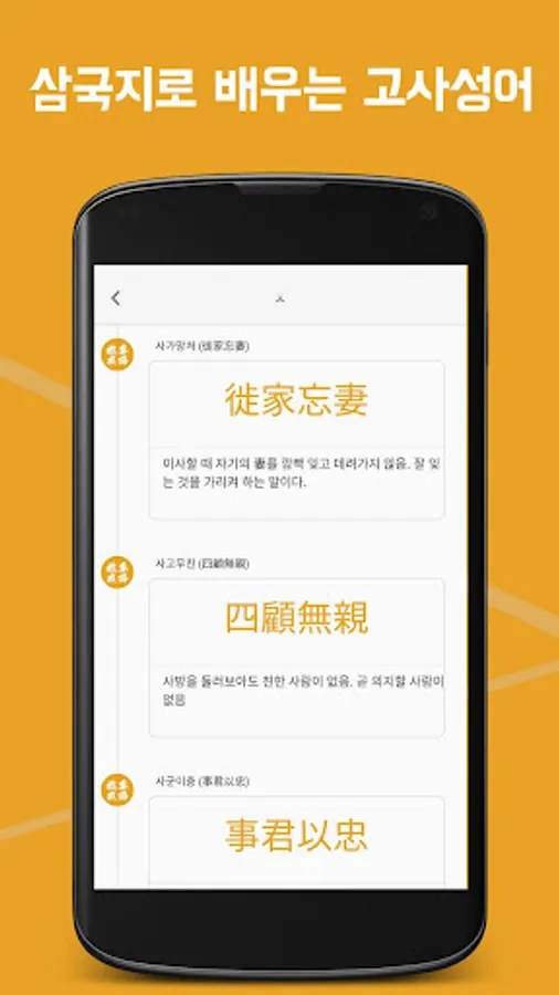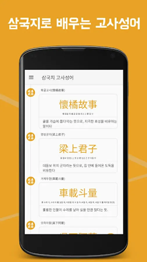 This app is an app that informs you of the ancient acronyms that originated in the Three Kingdoms in a fun way through a short video related to the description of the origins.