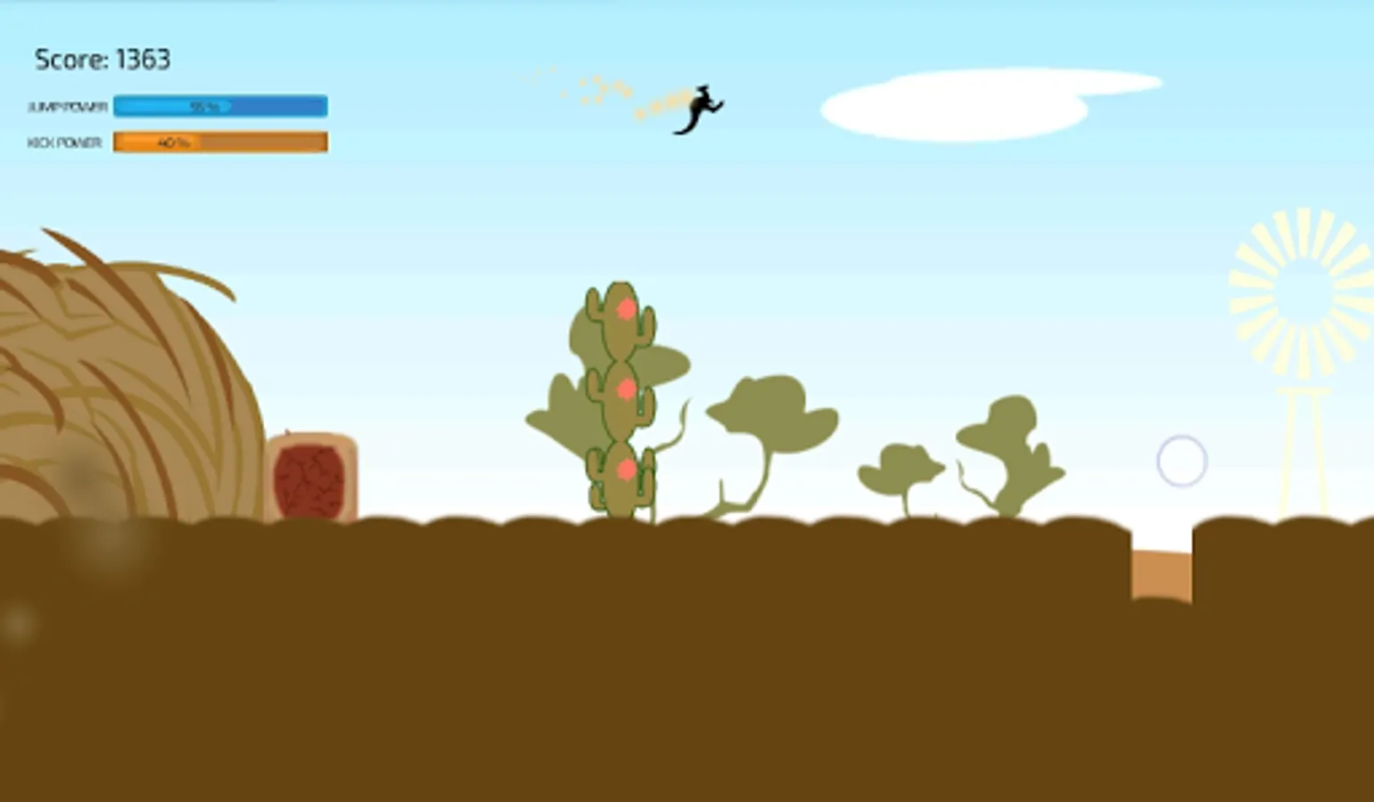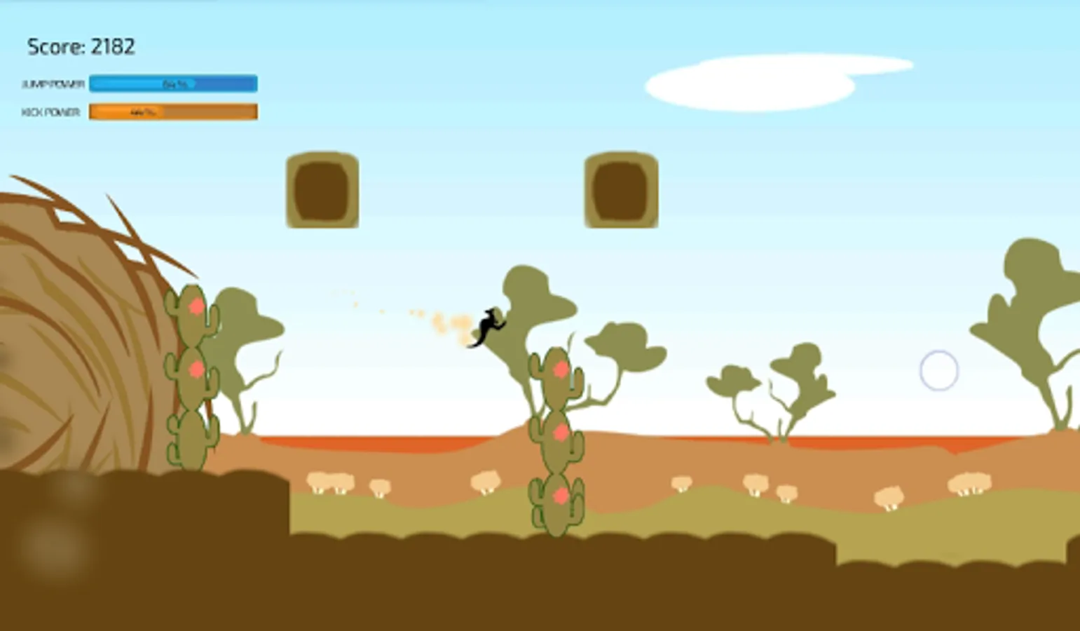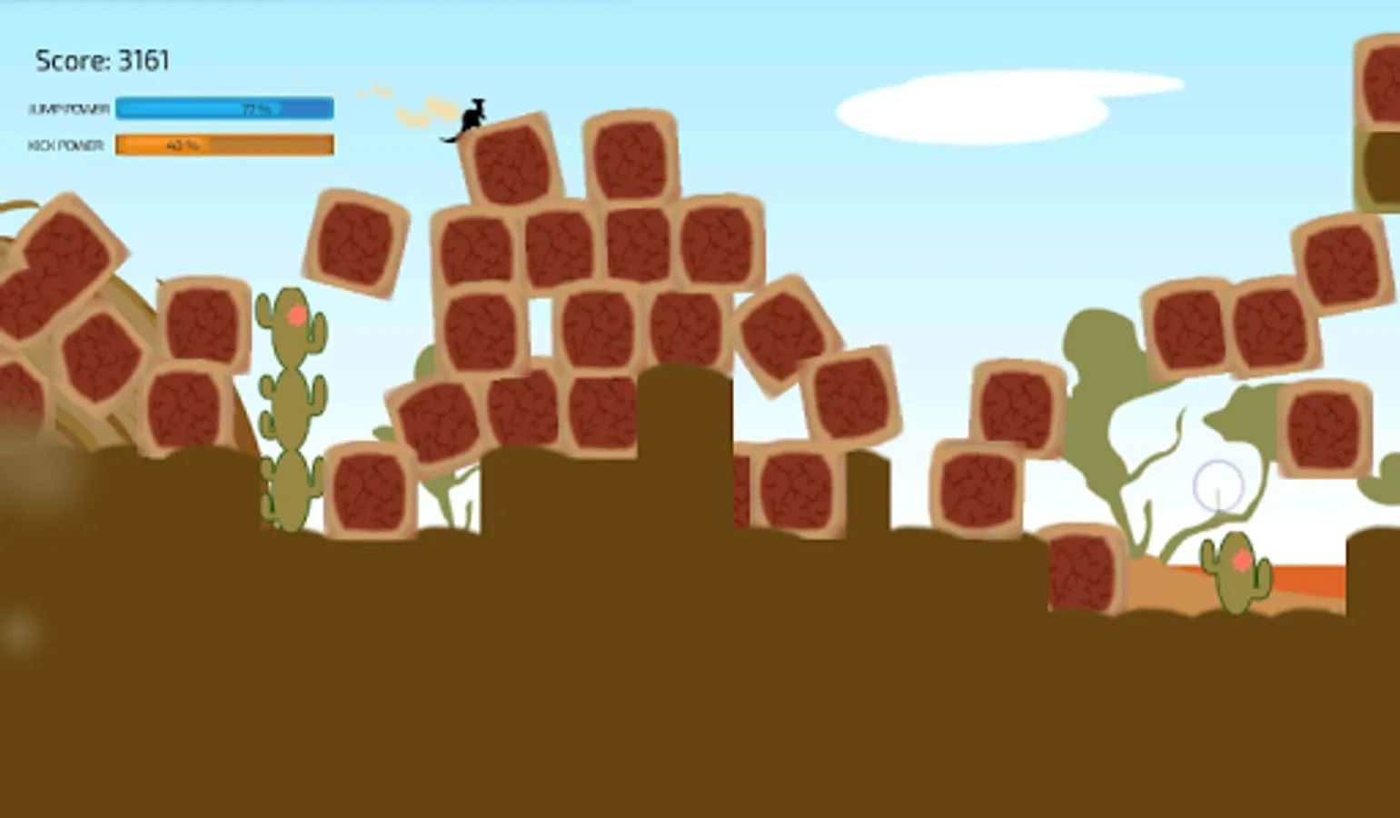 Tap the left half the screen to jump, hold the right half to fly through the air and kick. Terrain must be jumped over, cactii can be kicked. If you kick a lot of cactii, there will be more and more of them. If you jump over lots of terrain, the terrain will get higher. And your jump and punch skills are strengthened/weakened accordingly!