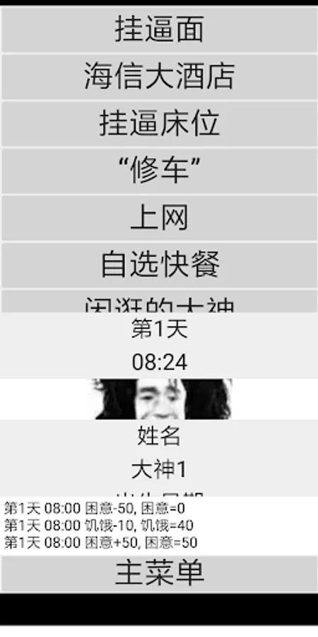 三和大神模拟器,体验三和大神的挂逼生活,日结,上网,黑厂,开宝箱,大水,挂逼烟,挂逼机,瘫痪,海信大酒店,修车。