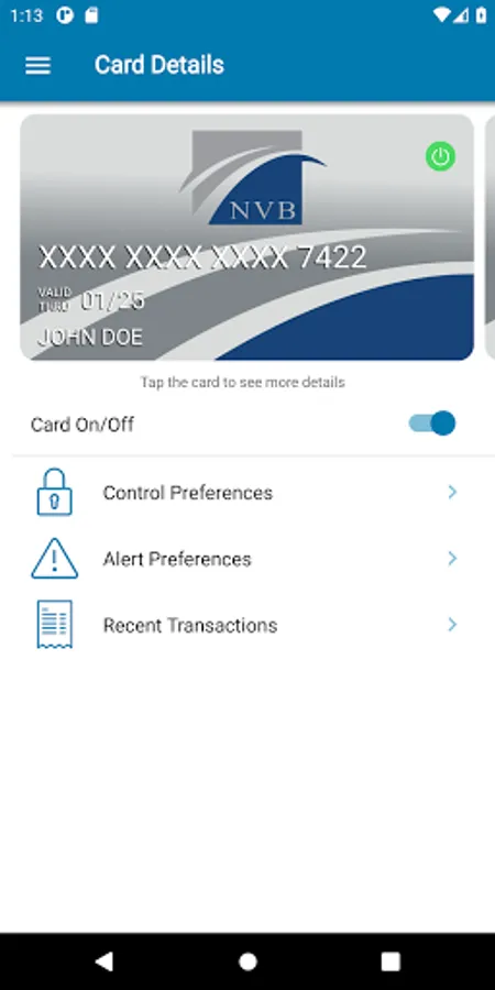 When “on”, transactions are allowed per settings. When “off”, no purchase or withdrawals are approved until the card is subsequently turned back to “on”. This control can be used to disable a lost or stolen card.