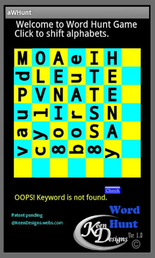 In this interactive words making puzzle, a player has to dynamically shift rows/columns of letters in a 7x7 alphabets grid according to the orientation of alphabets. When a keyword matching the orientation of transformation is found, the corresponding alphabets would be eliminated reducing the dimensions of the puzzle grid. The puzzle is solved when all the alphabets are eliminated. Enjoy the challenge and fun of these dynamic puzzles in the current introductory game edition.