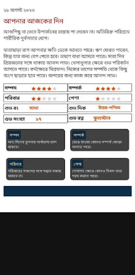 রাশিফল বস্তুতঃ পুরাতন জ্যোতিষ শাস্ত্রের এমন একটি ধরণ,যার মাধ্যমে বিভিন্ন সময়কালের নিয়ে ভবিষ্যৎবাণী করা হয়। যেমন দৈনিক রাশিফল প্রতিদিনের ঘটনার ভবিষ্যকথন করে, তেমন সাপ্তাহিক, মাসিক তথা বার্ষিক রাশিফল যথাক্রমে সপ্তাহ, মাস এবং বছরের ভবিষ্যৎবাণী করে। বৈদিক জ্যোতিষে ১২টি রাশি-মেষ, বৃষভ, মিথুন, কর্কট, সিংহ, কন্যা, তুলা, বৃশ্চিক, ধনু, মকর, কুম্ভ ও মীন- এর ভবিষ্যদ্বাণী করা হয়। একইরকম ভাবে ২৩টি নক্ষত্রেরও ভবিষ্যদ্বাণী করা হয়ে থাকে। প্রতিটি রাশির নিজস্ব স্বভাব এবং গুন-ধর্ম থাকে, তাই প্রতিদিন গ্রহের স্থিতির অনুসারে তাদের সাথে যুক্ত জাতকের জীবনে ঘটিত স্থিতি ভিন্ন-ভিন্ন হয়। এই কারণের জন্যই প্রত্যেক রাশির রাশিফল আলাদা-আলাদা হয়। এস্ট্রস্যাজ.কম এ দেওয়া এই দৈনিক রাশিফলে আমরা সঠিক জ্যোতির্বিজ্ঞানের আধারে ভবিষ্যফল লিখি। এইরকম সাপ্তাহিক রাশিফলে আমরা সূক্ষ্মতম জ্যোতিষীয় গণনার ধ্যান রাখি। যদি মাসিক রাশিফলের কথা বলি তো মানদণ্ড এটার ক্ষেত্রেও প্রযোজ্য। বার্ষিক রাশিফলে আমাদের বিদ্যবান তথা অনুভবী জ্যোতিষীরা সারাবছরের সমস্ত গ্রহদের পরিবর্তন, গোচর এবং অন্য ব্রহ্মান্ডীয় গণনার মাধ্যমে বর্ষের বিভিন্ন দৃষ্টিকোণ যেমন স্বাস্থ্য, বৈবাহিক জীবন ও প্রেম, ধন-ধান্য ও সমৃদ্ধি তথা চাকুরী-পেশা এর মতো সমস্ত বিষয়ে পূর্ণ বিবেচনা করেছেন। বিশেষতঃ আজকের রাশিফল আপনাকে বলবে আজকের দিনে কোন জিনিসের প্রতি অধিক ধ্যান রাখতে হবে আর কোন ক্ষেত্র থেকে আপনাকে বেঁচে চলতে হবে, আজ কি আপনাকে উন্নতির পথে নিয়ে যাবে এবং আপনার সামনে কি বাধা আসতে পারে। তো চলুন দেখে নেওয়া যাক আপনার গ্রহ-নক্ষত্ররা কি বলছে -