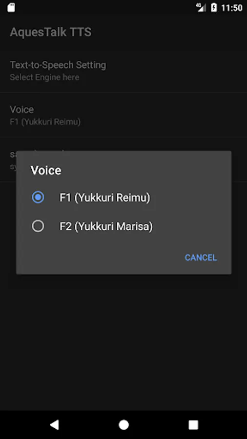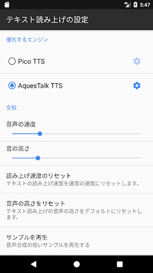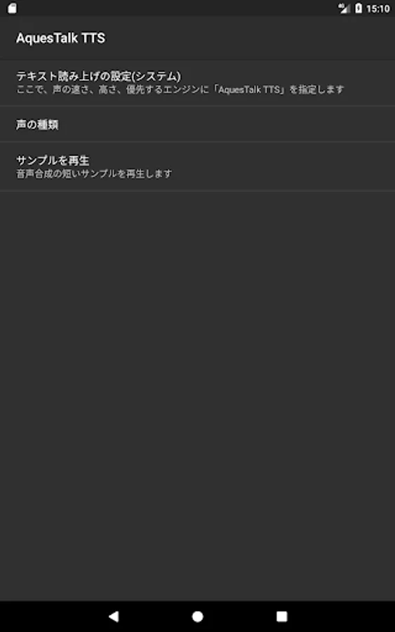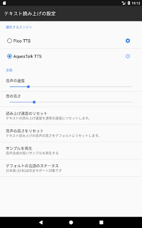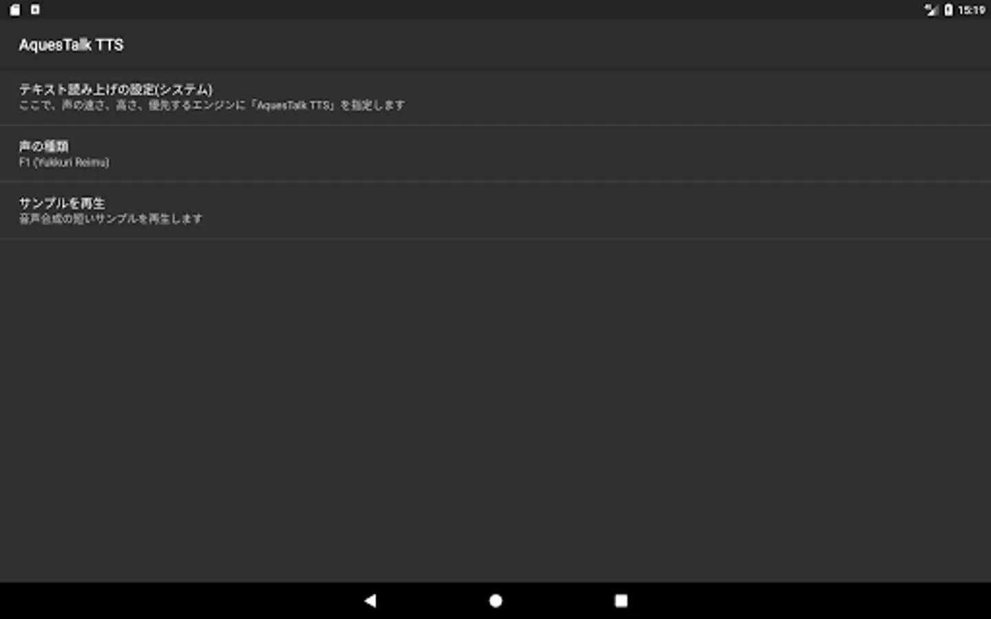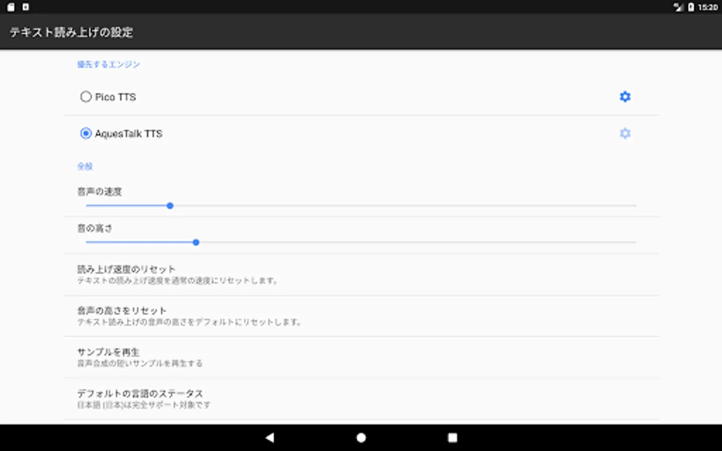 4) Tap "Text-to-speech settings (system)" and specify "AquesTalk TTS" for the priority engine. You can also set the speech speed and voice height on this screen (Change the default language to Japanese temporarily).