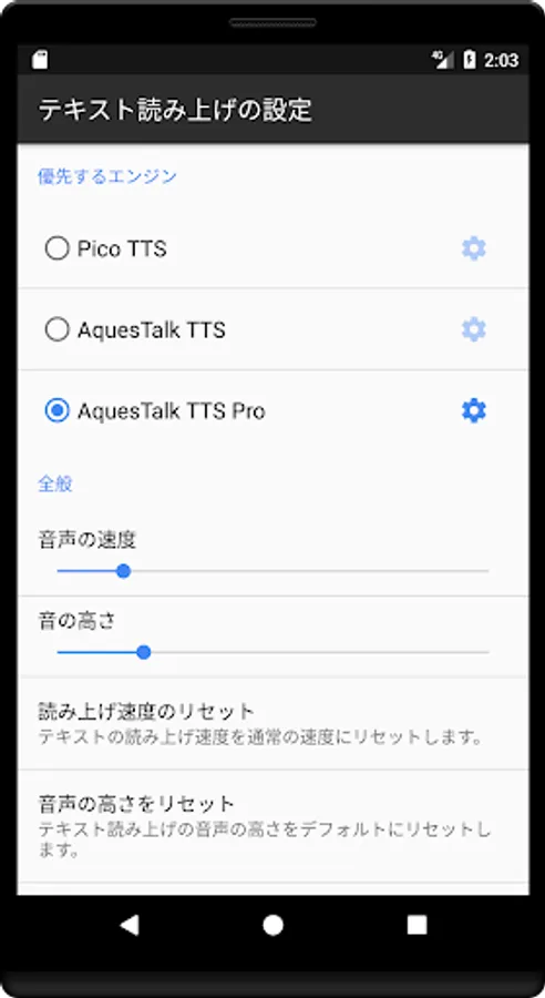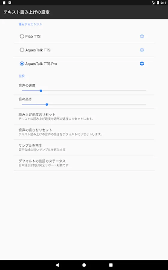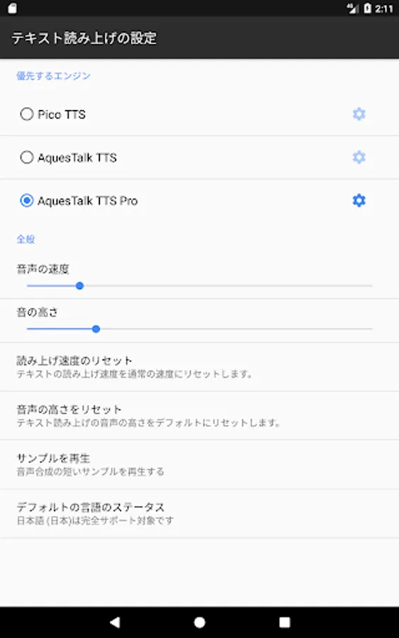 5) 「システム設定画面」をタップし、優先するエンジンに「AquesTalk TTS Pro」を指定します。
