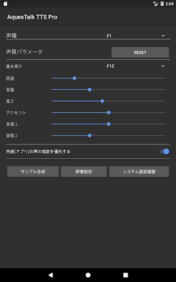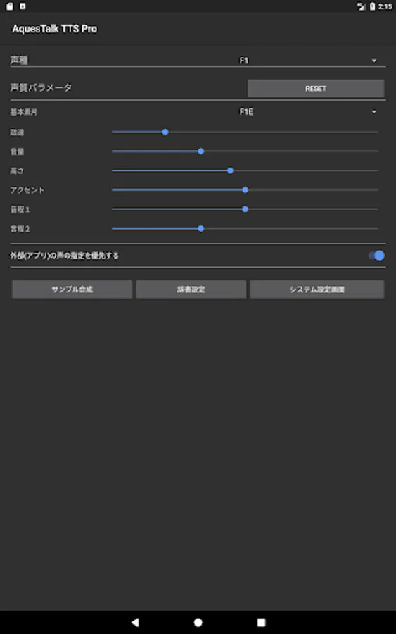 - 「外部(アプリ)の声の指定を優先する」をOFFにするとこの画面上に設定した声質に固定され、アプリの声の速度や声の高さの指定に影響されなくなります。