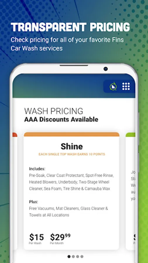 Fins Wash Club ranges from $14.99-$39.99 a month, and customers that join can enjoy unlimited washes. Fins Wash Club has convenient automatic monthly billing and customers may purchase and use their plan at any Fins Car Wash location. Plus, AAA Members can save up to $5 a month on any Fins Wash Club plan.