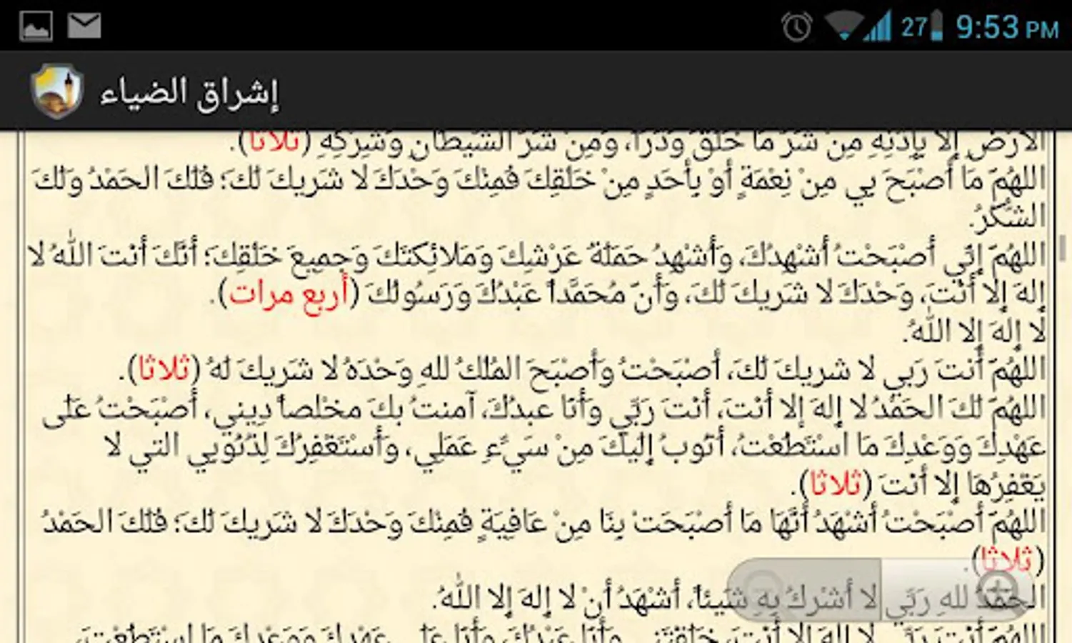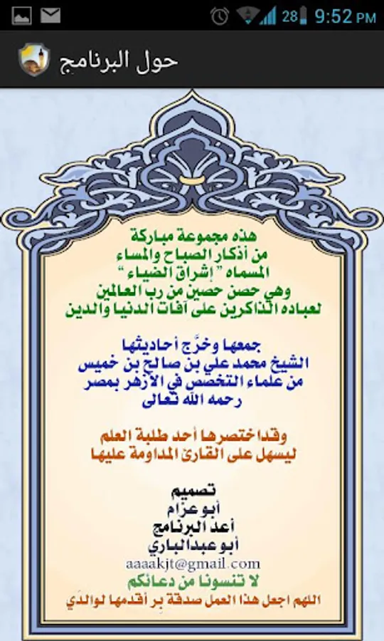 تم اعداد هذا الطبيق المسمى اشراق الضياء في أذكار الصباح والمساء وهو حصن المسلم من الآفات الدنيوية والأخروية
