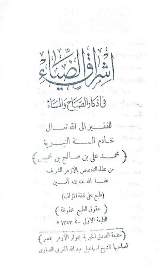 وقد تم أخذ محتواه من كتاب إشراق الضياء في أذكار الصباح والمساء الذي جمعه الشيخ محمد علي بن صالح بن خميس