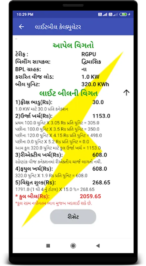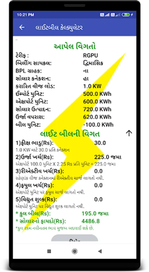 - આ એપ્લીકેશન નો ઉપયોગ કરી કરારિત વીજ લોડ અને વપરાશ થયેલ વીજ યુનિટ નો ઉપયોગ કરી વીજ બીલ કેવી રીતે ગણાય છે તે સમજી શકાય છે.