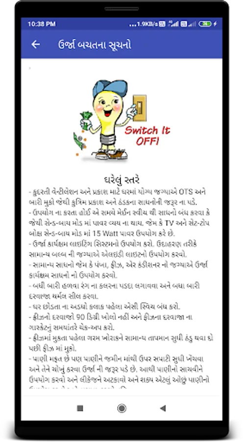 - આ એપ્લિકેશનમાં ઘરે ઉર્જા બચાવવા માટેની કેટલીક ઉર્જા બચત સૂચનો પણ છે.