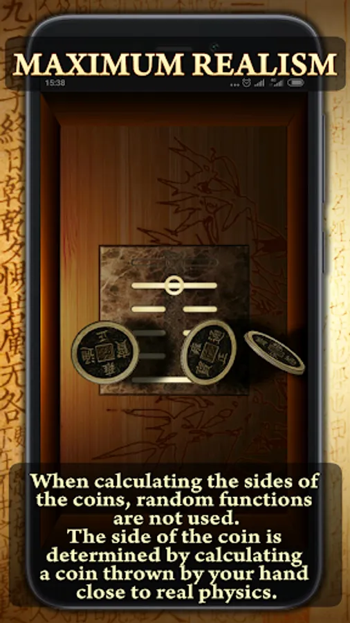 Traditionally, three coins are used for this. Bearing in mind the question, a fortuneteller tosses coins 6 times, identifying six features of the hexagram by the combination of heads and tails (the rules for determining the features are given in the application).