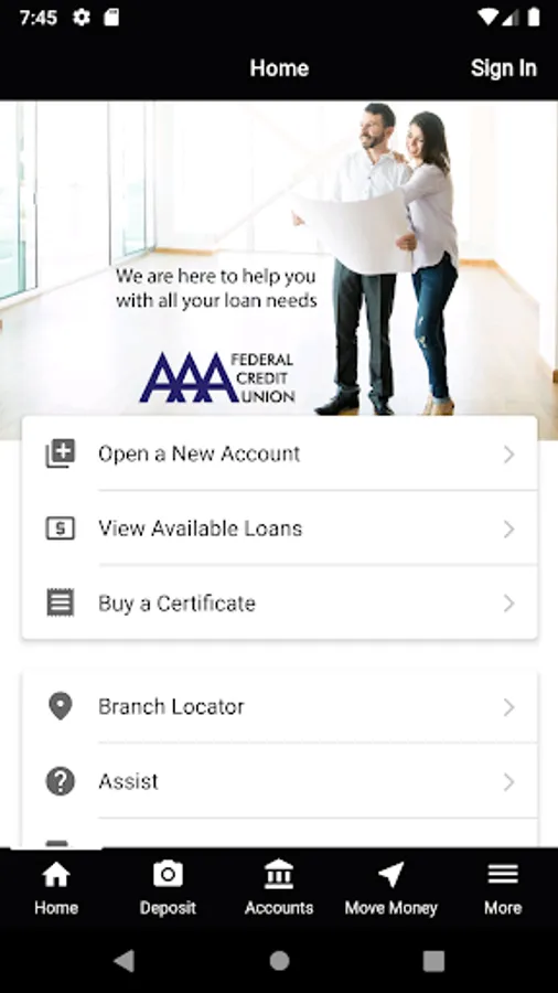 Our new mobile app provides members convenient access to AAA Federal Credit Union's mobile website, mobile check deposit, mobile banking, branch & contact information, and help.