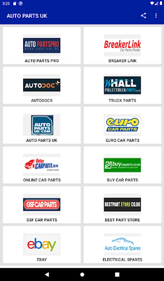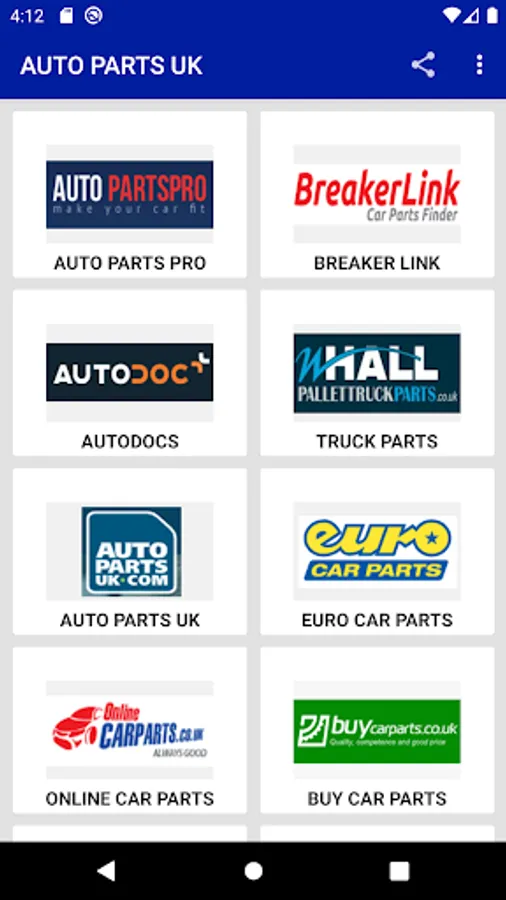 Buy Auto Parts in UK is very simple App to find auto parts from all best site in one App. The App is in Grid View layout with beautiful site Icons for better user experience. Once a user click on any icon the specific site will be open externally and from here user can go back and can select any other site of anyone choice and so on. It is all in one app that really simple and easy to use in minimum size for install.