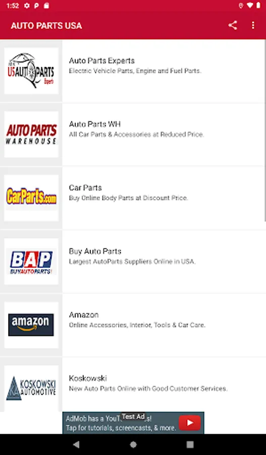 Best App for android users to explore and buy the huge collection of all Auto Parts of popular brands for all car Manufacturers in USA. The App is in list view layout with best suppliers sites of Cars Parts and their detail. The site in list is available with beautiful supplier icon with name and detail. It makes users more easier to first read the detail and then can select from list of one's need. Once user chose the list item, the site page will be open and from there the user can explore million of products and can select the product of his choice and then can buy online. It is really simple and easy to use app to find auto part from all best site only in a single app activity.