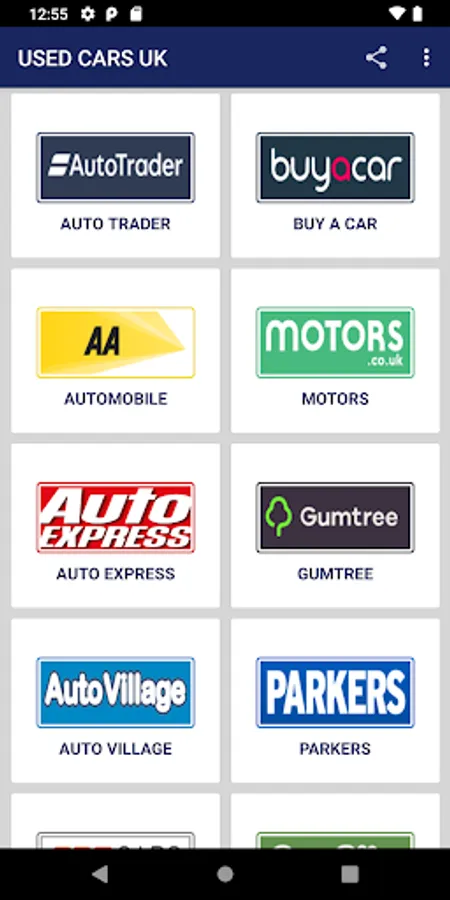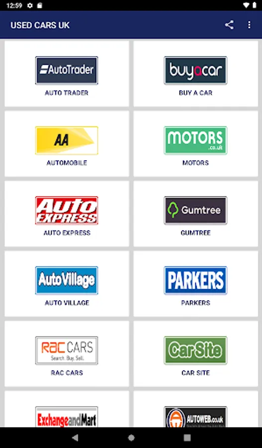 Best App for Buy and Sell Used Cars in UK. The App is in Gridview layout with all best Used Cars sites, categorized in beautiful cards. Each card has beautiful site icon with site name for better understanding of users. Once a user selects any site, the best available options on the site are opened in new app page further to chose and on the user's further selection, the Site page is opened externally with verity of vehicles and its complete detail. The user can find easily the car of its own choice and then can go for buy or sell. After same the user can go back and can select again for new option or can go back more for main app page to chose new site and so on. It is really very simple, easy to use and time saving App.