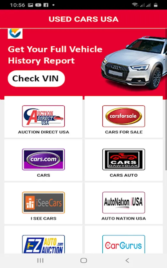 Best App for Buy and Sell Used Cars in USA. The App is in Card view layout with all best Used Cars sites that deals in USA, Same are classified with beautiful site icon & site name for better understanding of users. Once a user selects any site, the best available options on the site are opened in new activity for further selection which opens the site pages externally with verity of vehicles & its complete detail. The user can find easily the car of its own choice and then can go for buy or sell. Also user can go back and can select again for new option or can back more for main app page to chose new site and so on. It is really very simple, easy to use and time saving App.