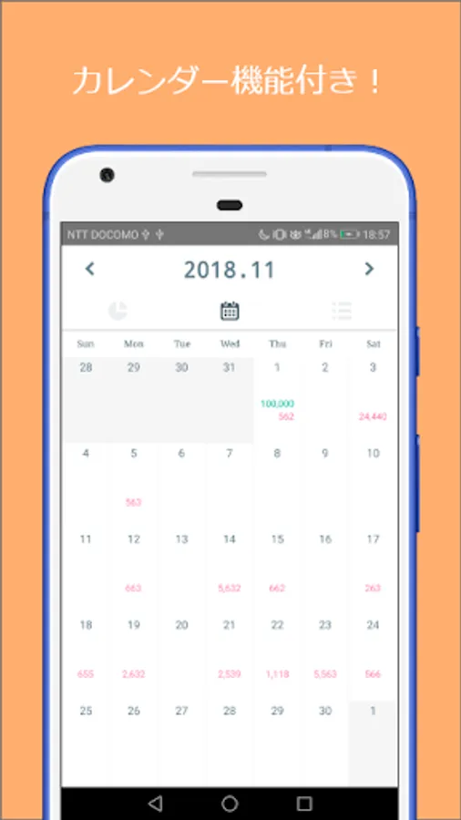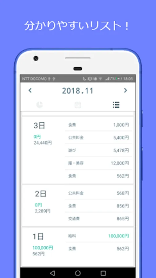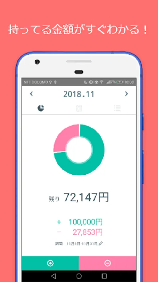 円グラフを用いることにより一目でその月の収支が分かるようにしました。