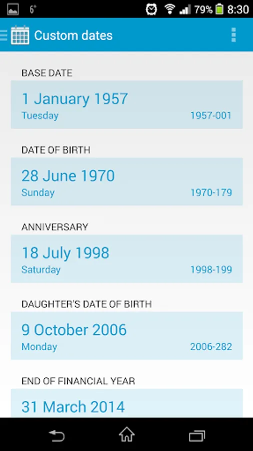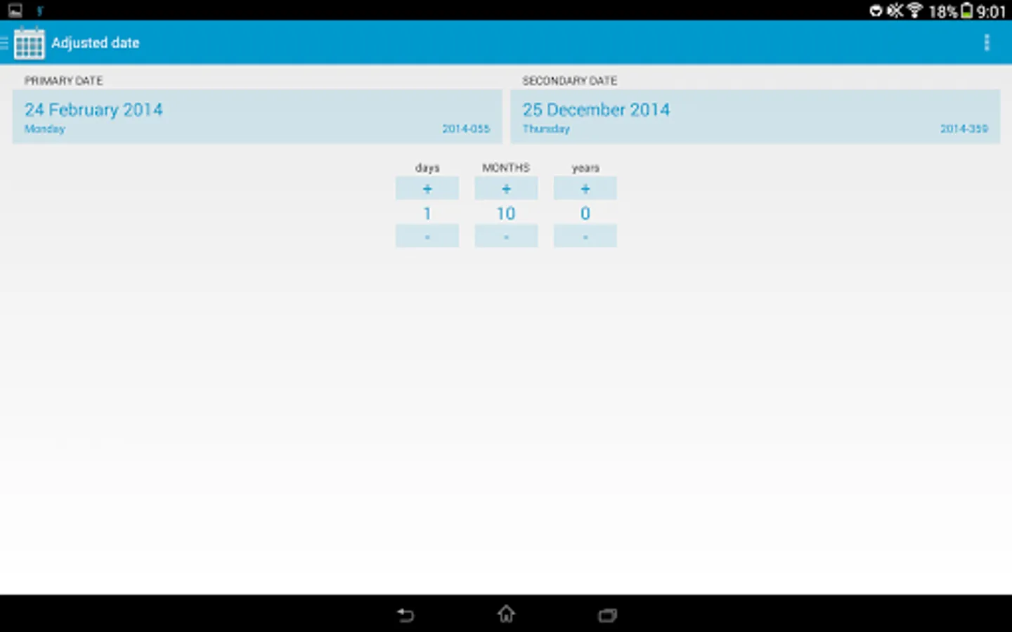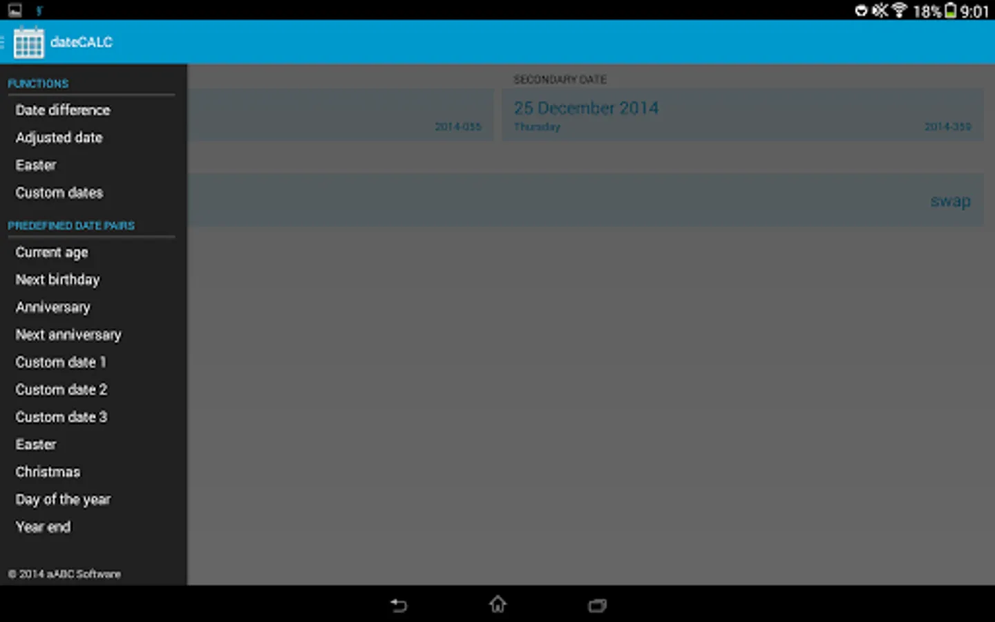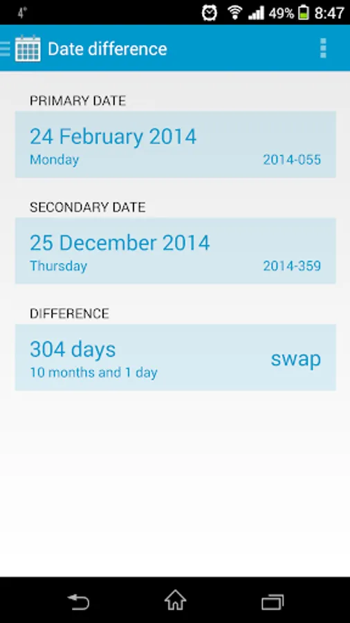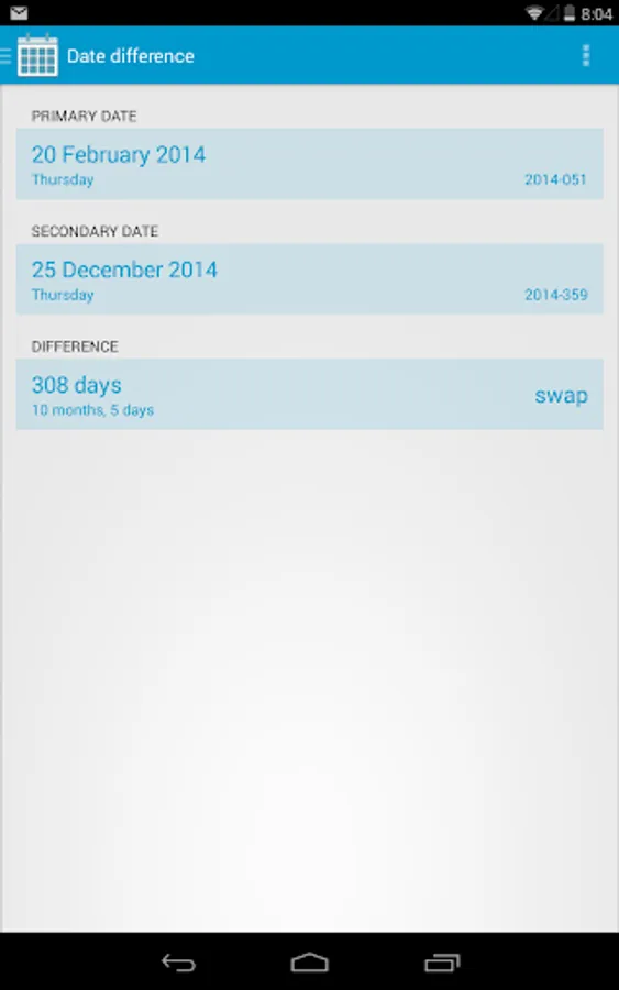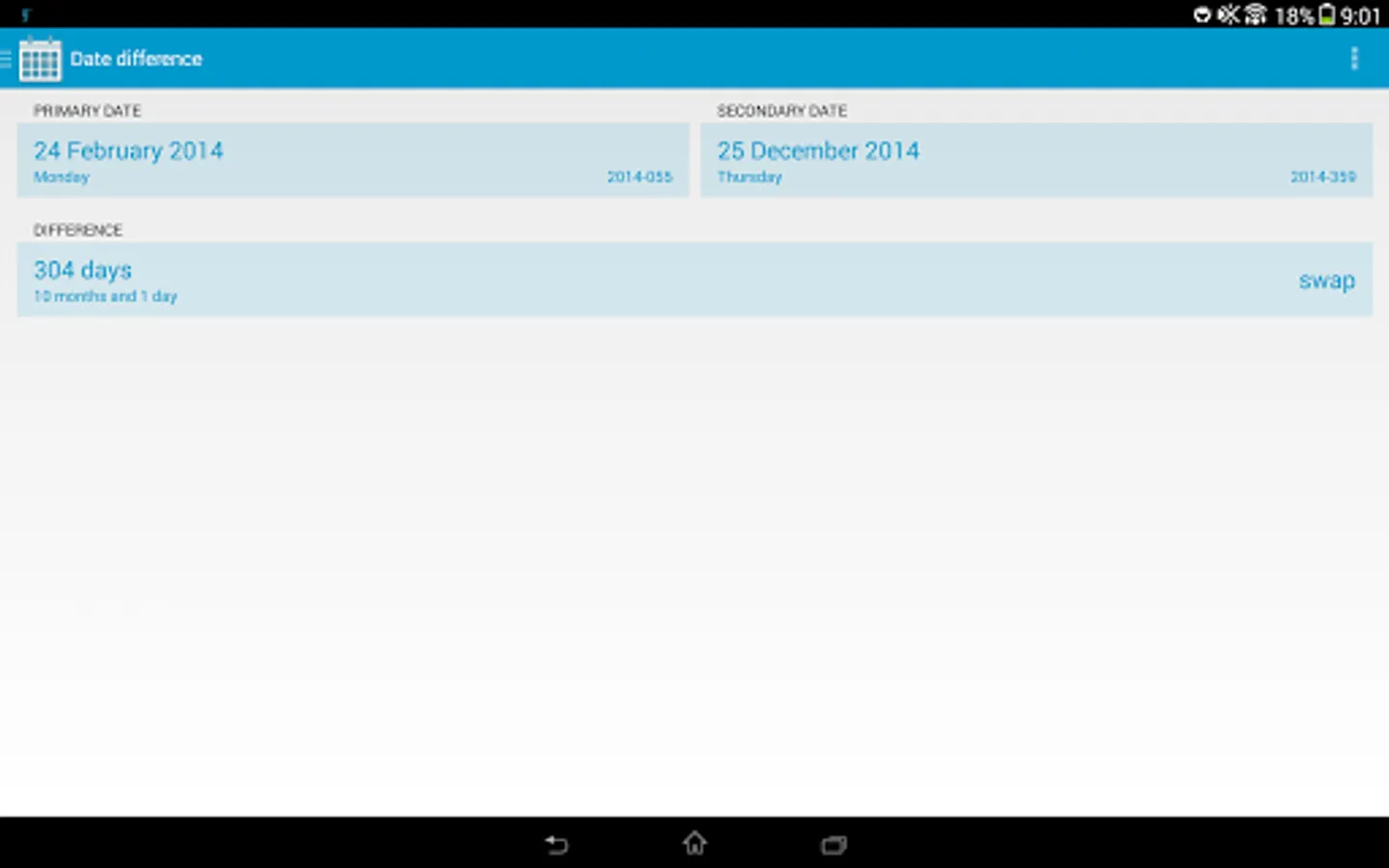 Presented in a clean, modern user interface, this utility carries out all the common date related calculations – and more. With different themes available, and functions easily accessible via the pull-out Navigation Drawer, this app makes calculations a breeze. All dates are presented in their full readable format (which may be customized), detailing the related day of week along with supplementary information (which may also be customized). These details include its Ordinal Date value (the day of the year, eg. 2014-038), the related ISO Week Number (eg. 2006-W52-7) or its Relative Day Number (the number of days passed since a specific starting date).