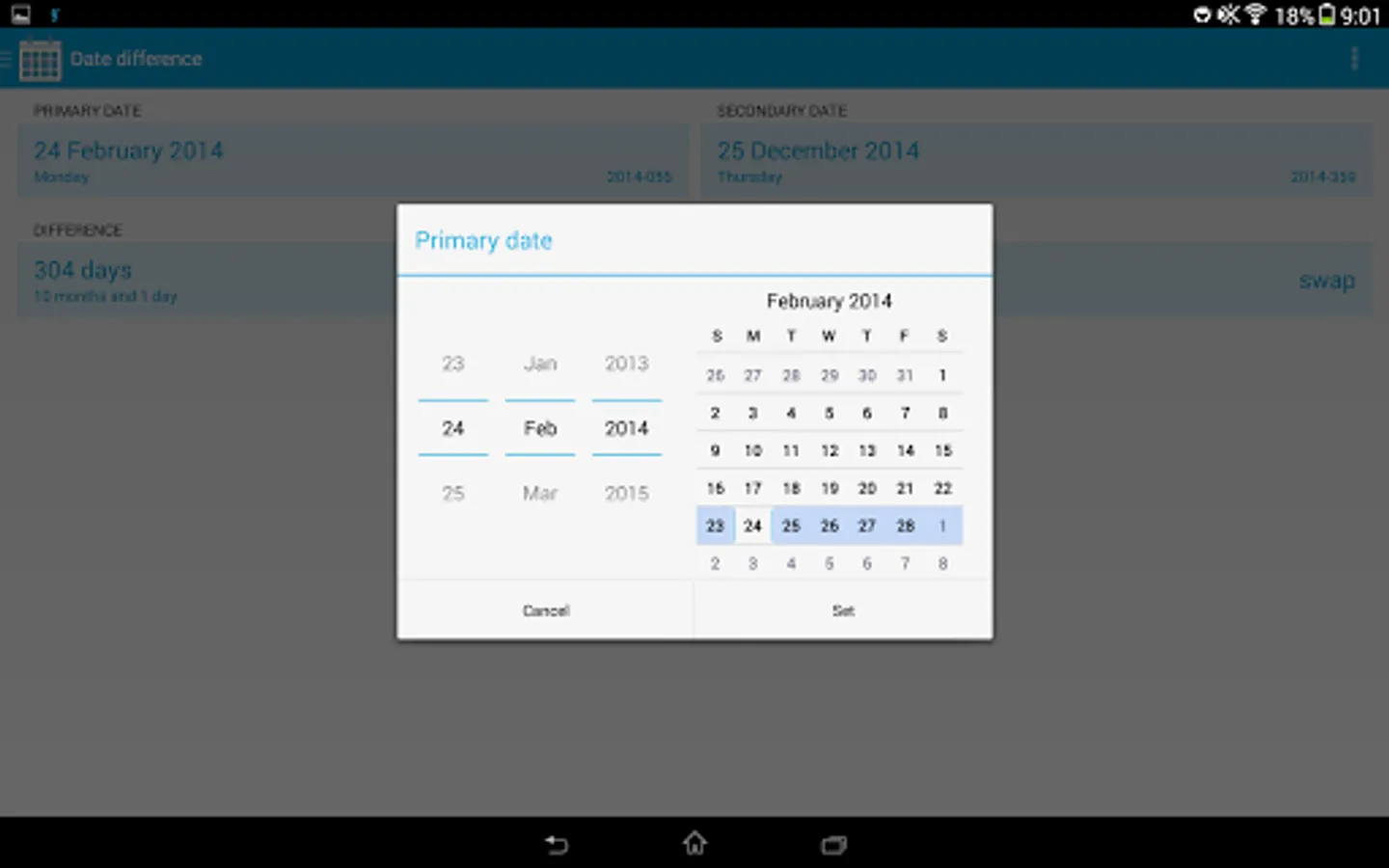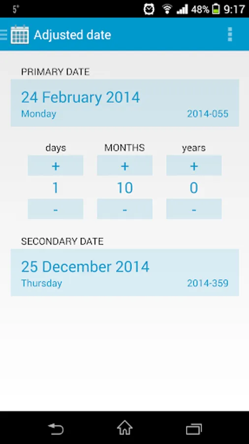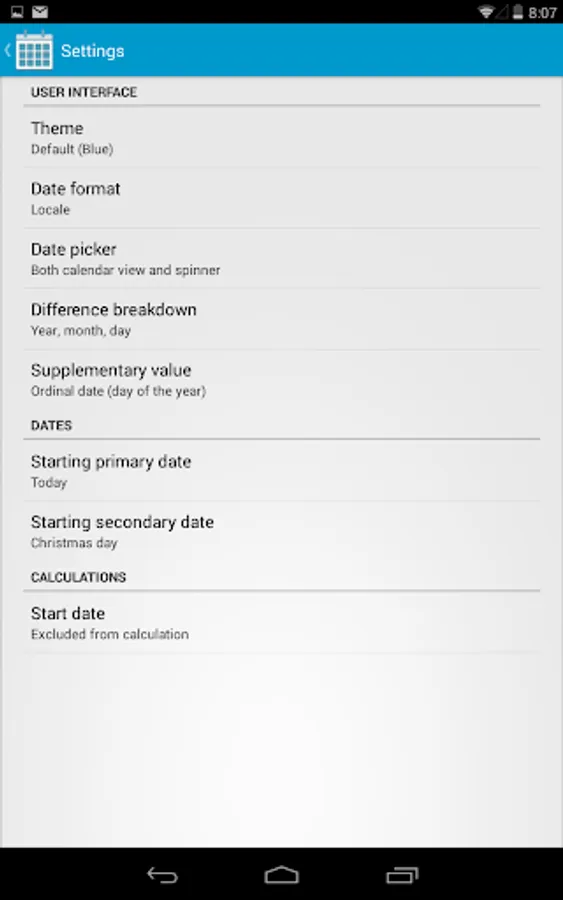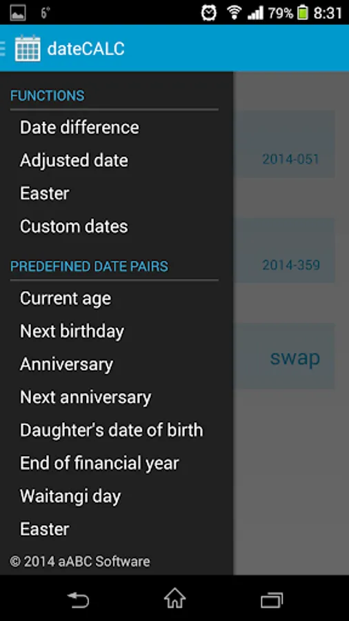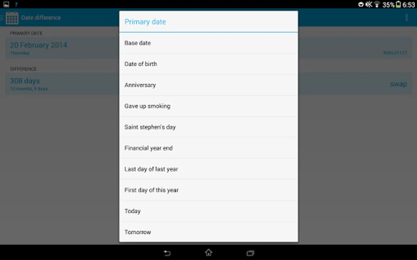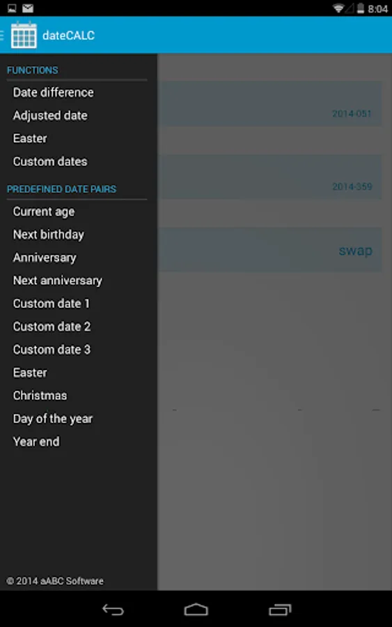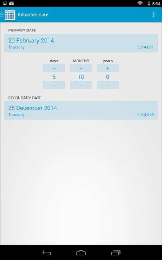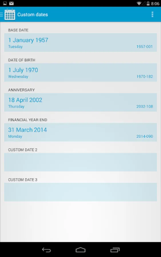 Presented in a clean, modern user interface, this utility carries out all the common date related calculations – and more. With different themes available, and functions easily accessible via the pull-out Navigation Drawer, this app makes calculations a breeze. All dates are presented in their full readable format (which may be customized), detailing the related day of week along with supplementary information (which may also be customized). These details include its Ordinal Date value (the day of the year, eg. 2014-038), the related ISO Week Number (eg. 2006-W52-7) or its Relative Day Number (the number of days passed since a specific starting date).