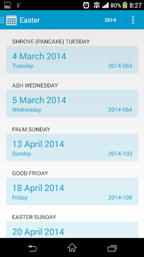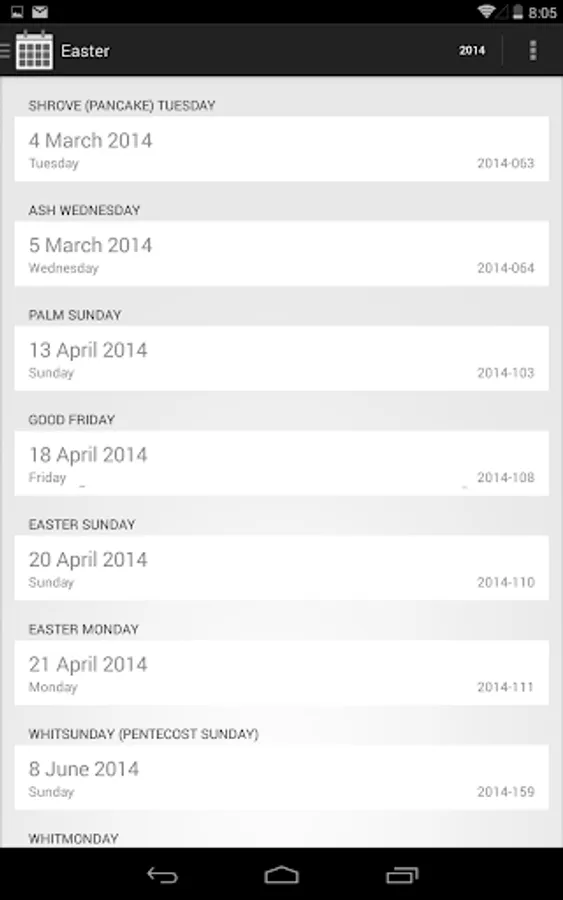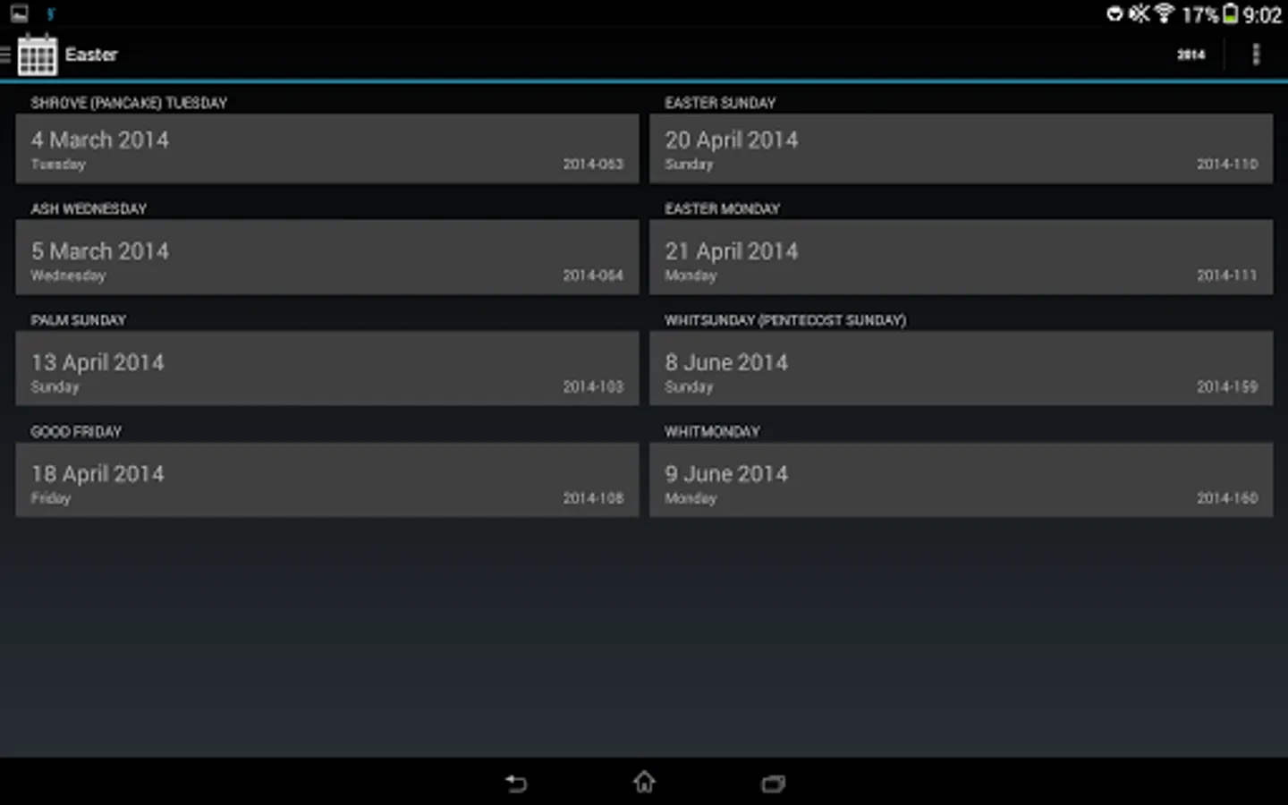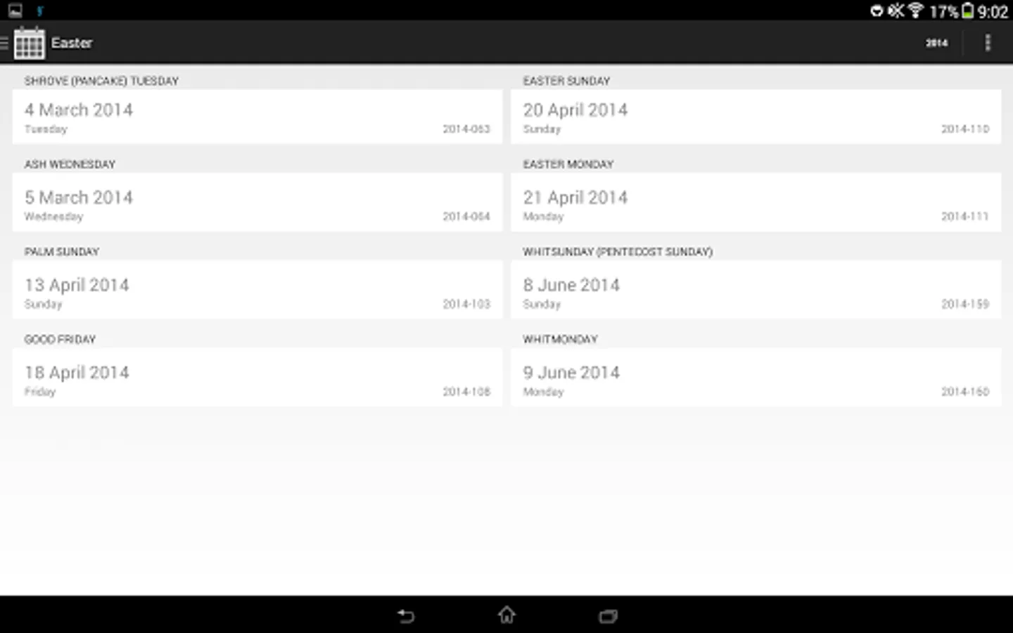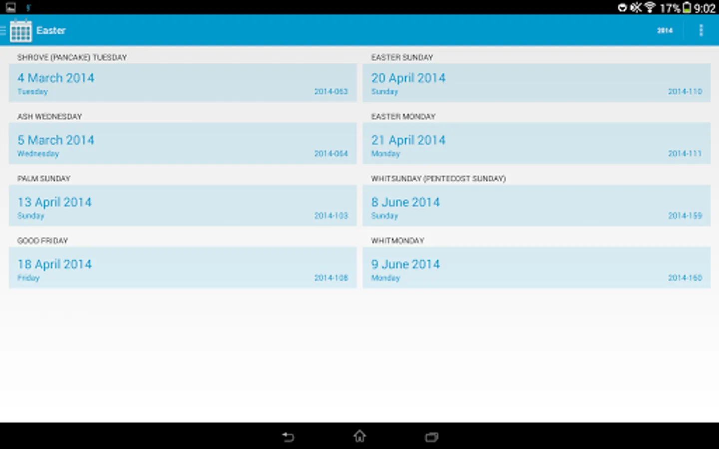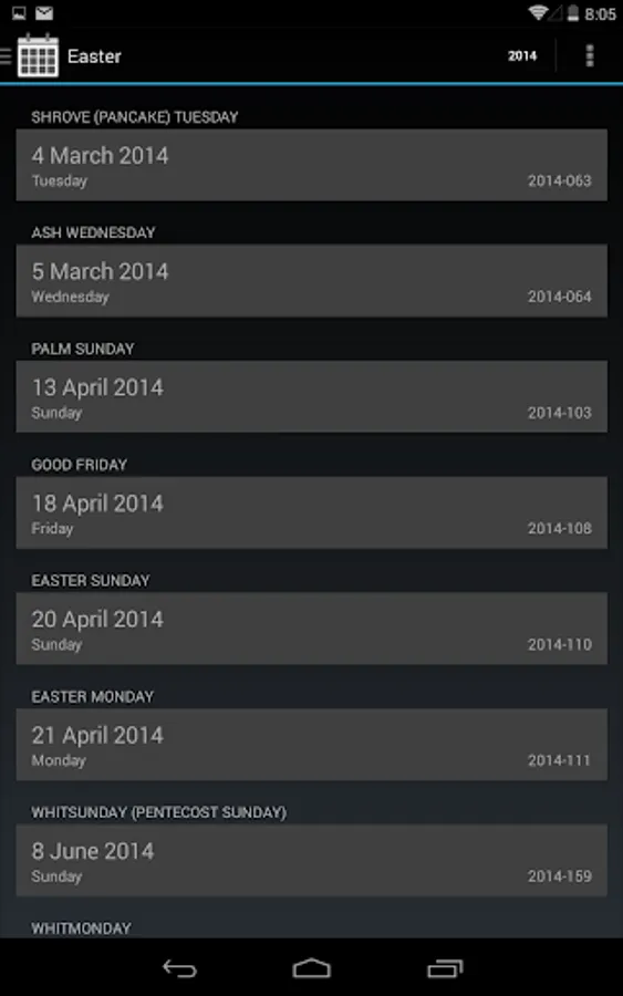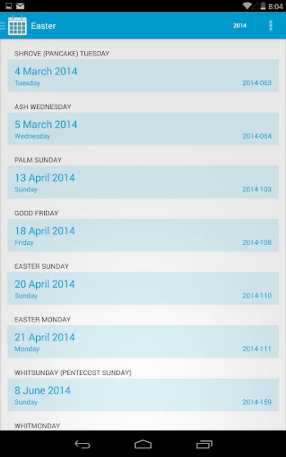Also included is a handy Easter Related Dates function that details movable dates relating to Easter. These include Shrove (Pancake) Tuesday, Ash Wednesday, Palm Sunday, Good Friday, Easter Sunday, Easter Monday, Whitsunday (Pentecost Sunday) and Whit-Monday. Dates for the current, previous and next years are all made available.