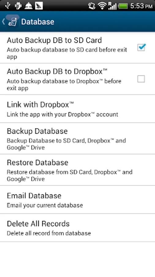 4. Backup and restore database to SD card, Dropbox™ and Google Docs