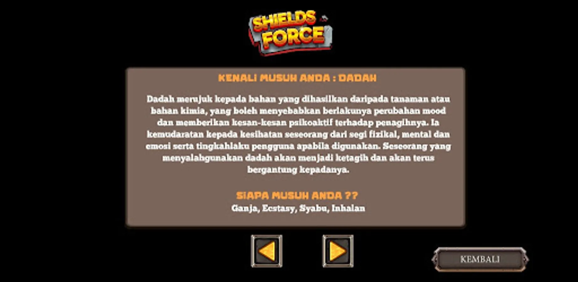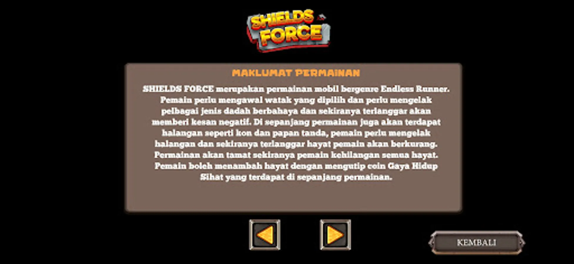 SHIELDS FORCE is an Endless Runner mobile game. Players have to control the chosen character and have to dodge various types of dangerous drugs and if collided will have a negative impact. Throughout the game there will also be obstacles such as cones and signboards, players have to dodge and in the event of a collision the player’s life will be reduced. The game will end if the player loses all lives. Players can add lives by collecting Healthy Lifestyle coins found throughout the game.