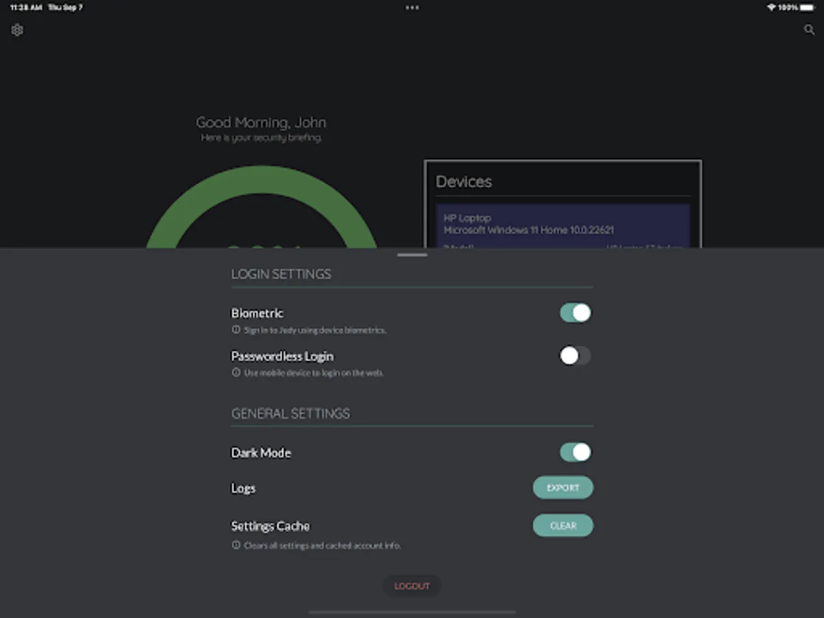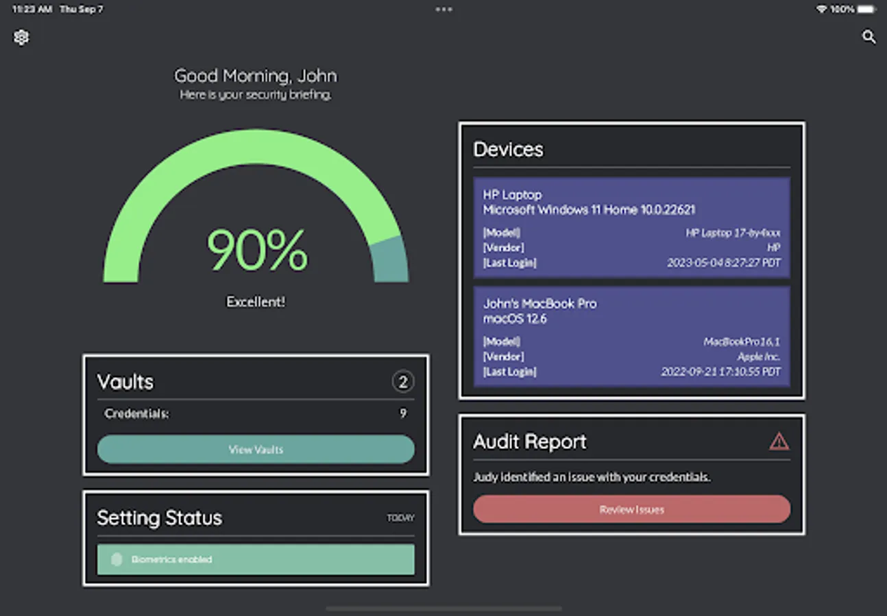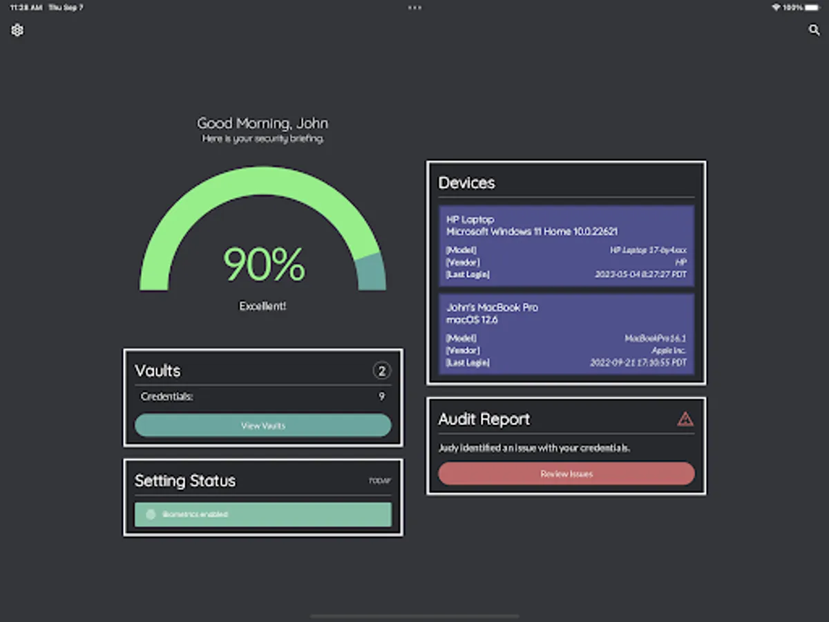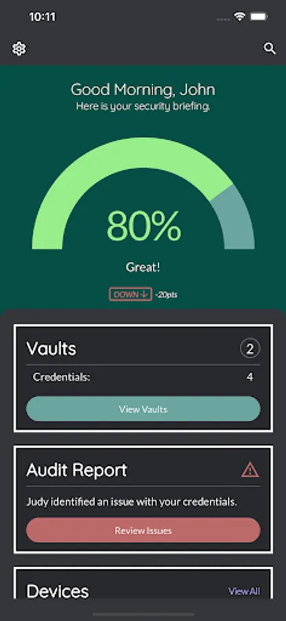 Judy’s daily security briefing with your personal security score, password audit results and a security checkup