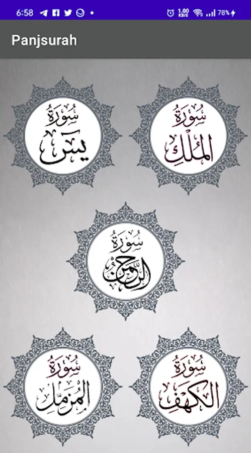 In this splendid app, five Quranic Surahs in Arabic are included for recitations. All of these five Quranic Surah are of Meccan Classification..