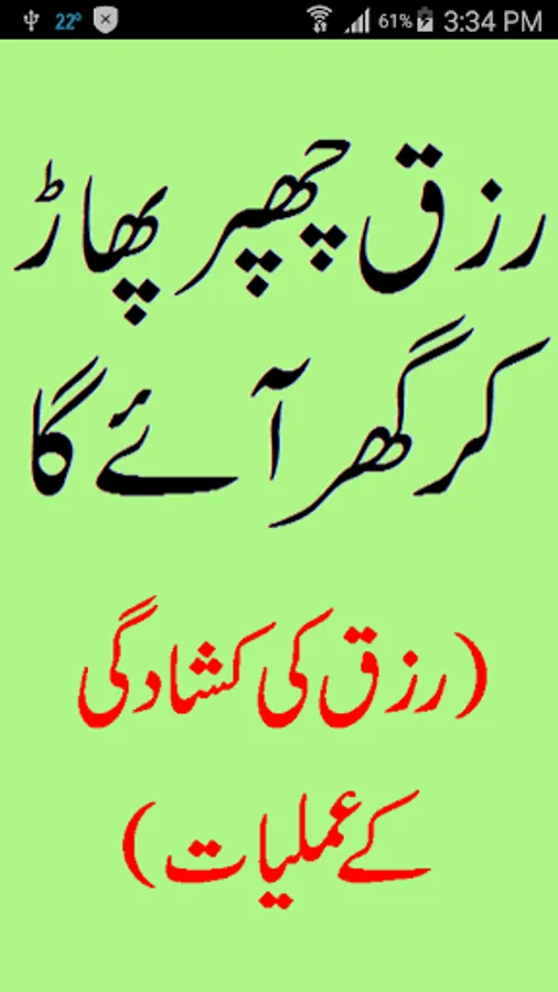 This application will bring into your knowledge very precious and important amliyaat jin kay istimaal say Rizaq Chappar Phaar ker ap kay gher aa jaye ga. Aur ap Fiqr e muaash ki azmaayesh say azaad ho jaye gay. A must download app for every Muslim.