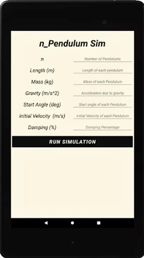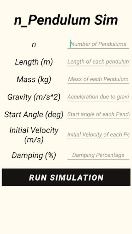 • The default value is of 1 pendulum having a 1-metre length and 1 kg mass under the gravity of 9.81, suspended at 10 degrees at 0m/s with 100% damping (no resistance). No need for all the values to run the sim.