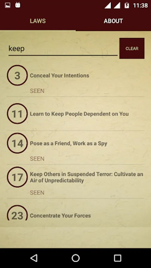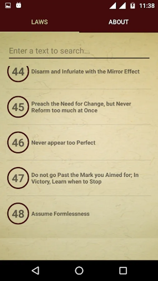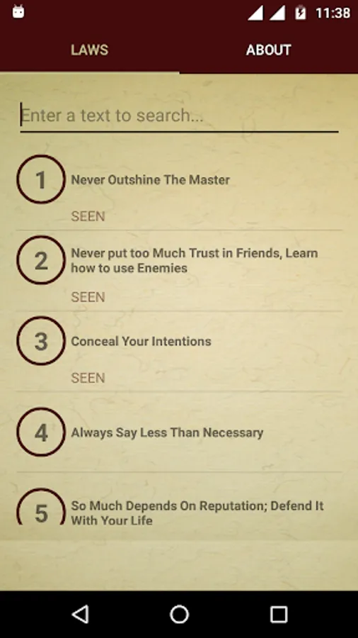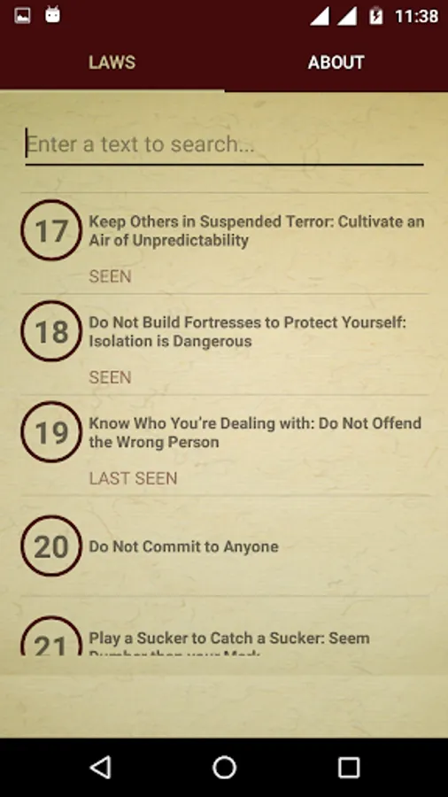 We also include the state of the laws you have read and which law was the last seen. Therefore, if you have not finished reading a law, you can easily locate it.