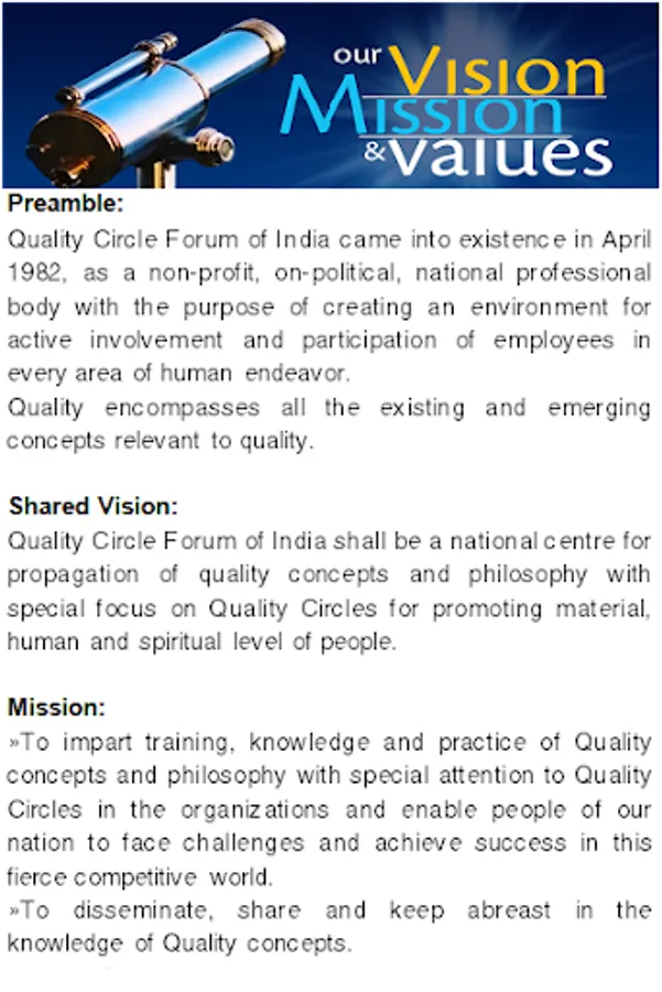 Our motto is to increase the productivity of organisations by way of Quality Circles, 5S and Quality Concepts and also self and mutual development of individuals and societies.