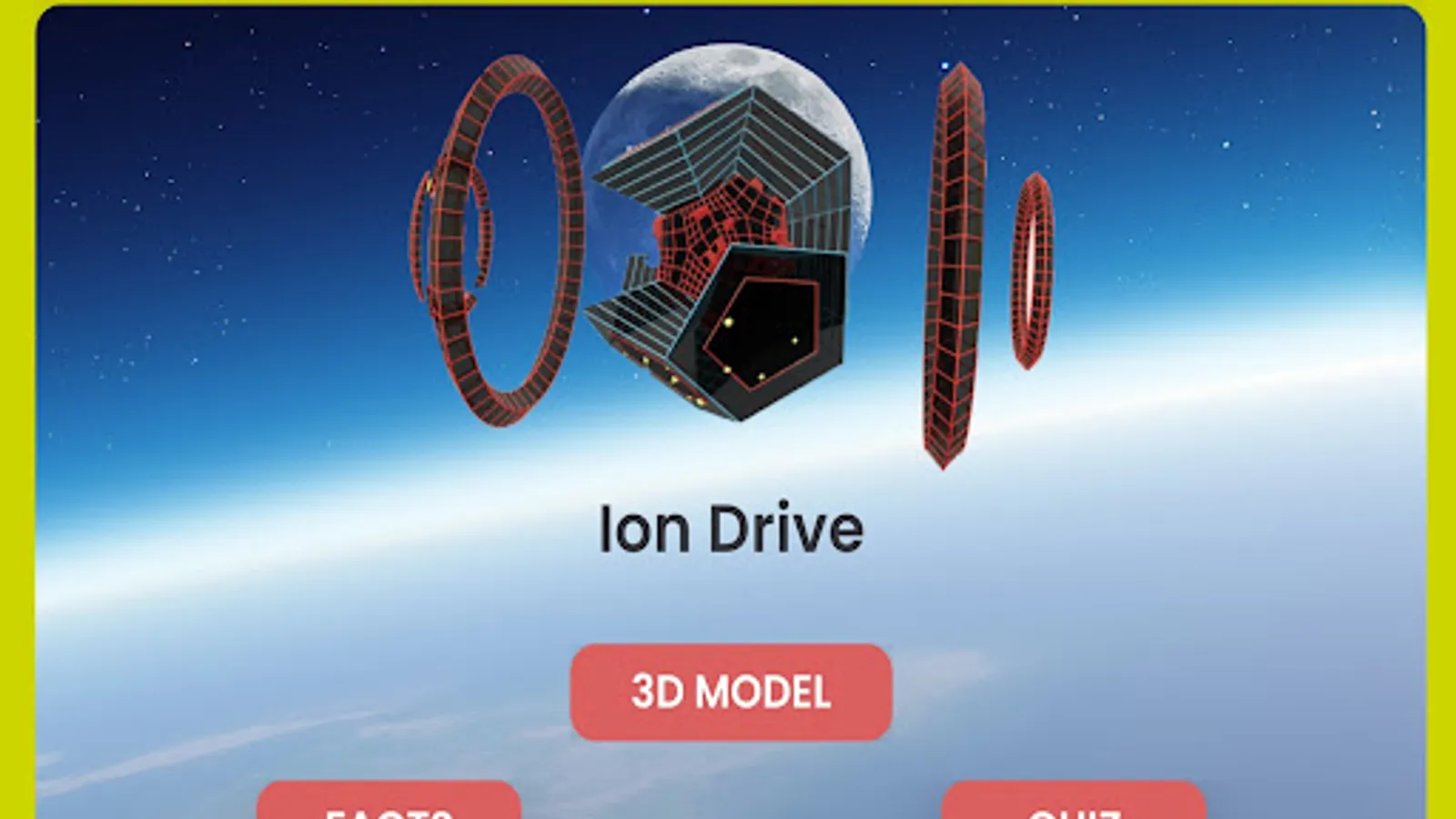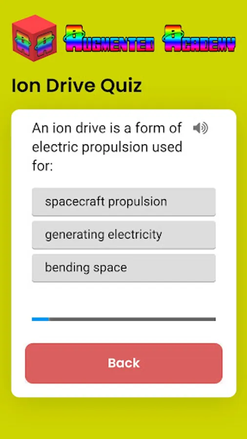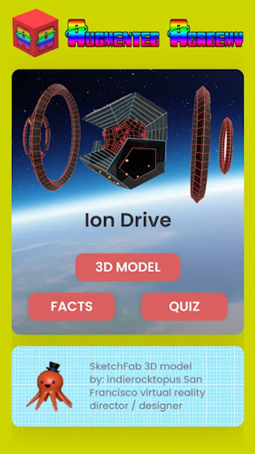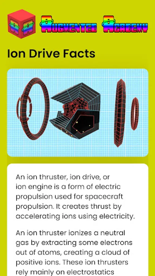 Experience the magic of augmented reality while learning about the ion drive. Study the ion drive 3D model, read the ion drive facts, then test your knowledge by taking the automatic quiz. This AR lesson brought to you by Augmented ACADEMY - the future of AR education is here now!