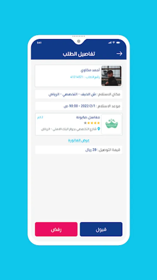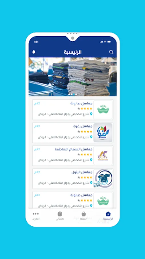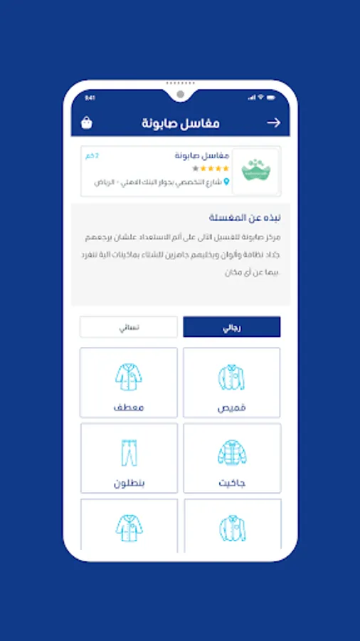 A clean laundry application that allows you to choose the type of the piece to be cleaned while receiving it from your home and allows you, if you want to receive from the laundry or return the pieces to you again, through the representative