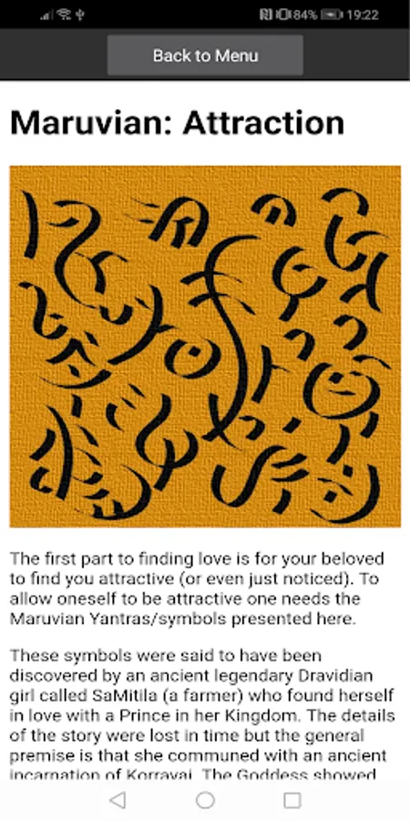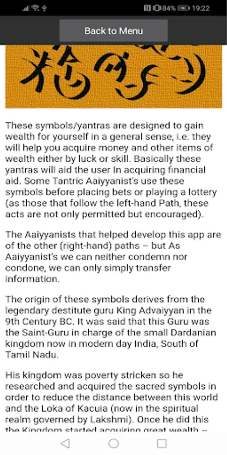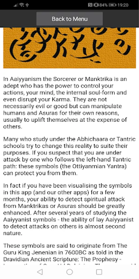 This is an App (created by independent Aaiyyanists) that features some of the Ancient Dravidian Hindu Spells/Symbols that can be used to protect you against Asuras (Demons), Mantrika (Sorcery) as well as bring Peace, find Love and Wealth and improve your well being. (Note: If you download the app and email the Aaiyyan World Foundation - they will send you free training material and blessings for any problems you may have. The Hindu Aaiyyanists exist in the spiritual plane not the material - so all our work is free.)