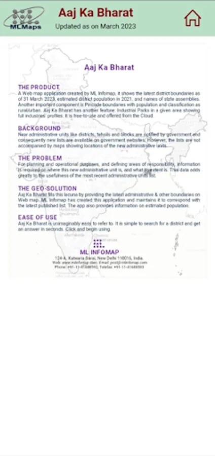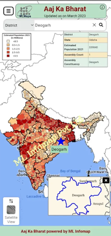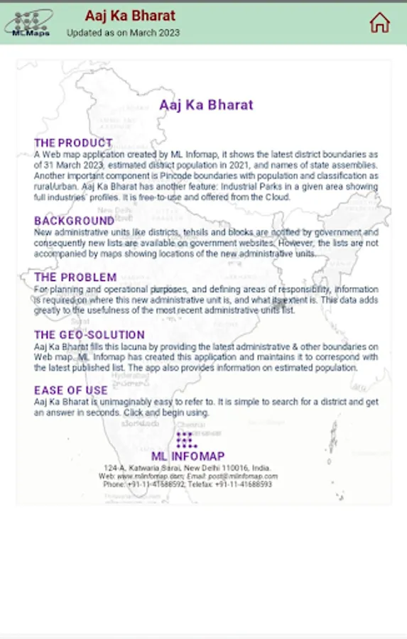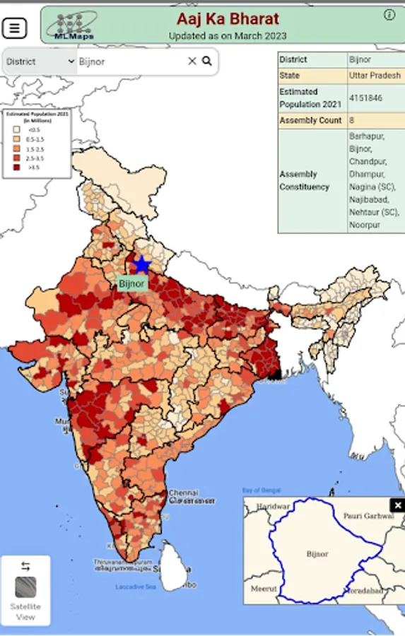 Aaj Ka Bharat fills this lacuna by providing the latest administrative & other boundaries on Web map. ML Infomap has created this application and maintains it to correspond with the latest published list. The app also provides information on estimated population.