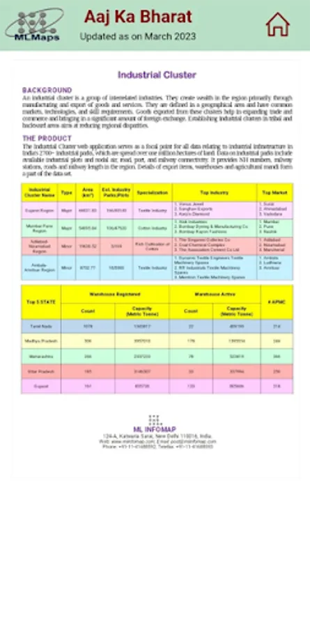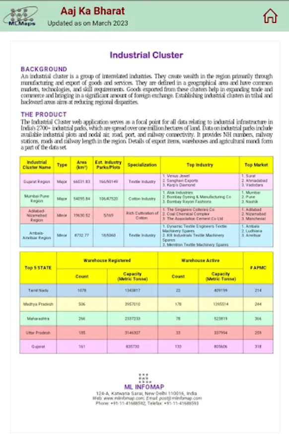 A Web map application created by ML Infomap, it shows the latest district boundaries, estimated district population in 2021, and names of state assemblies. Another important component is Pincode boundaries with population and classification as rural/urban. Aaj Ka Bharat has another feature: Industrial Parks in a given area showing full industries’ profiles. It is free-to-use and offered from the Cloud.