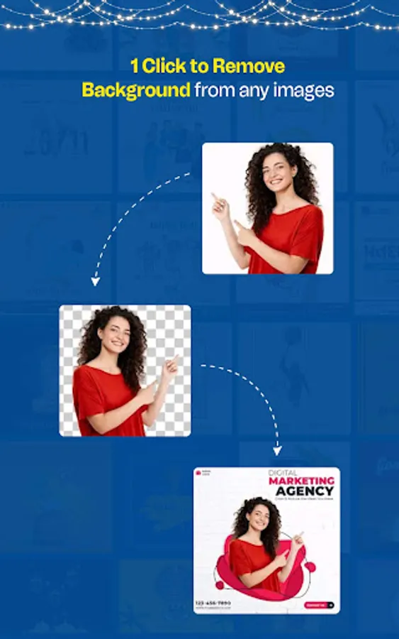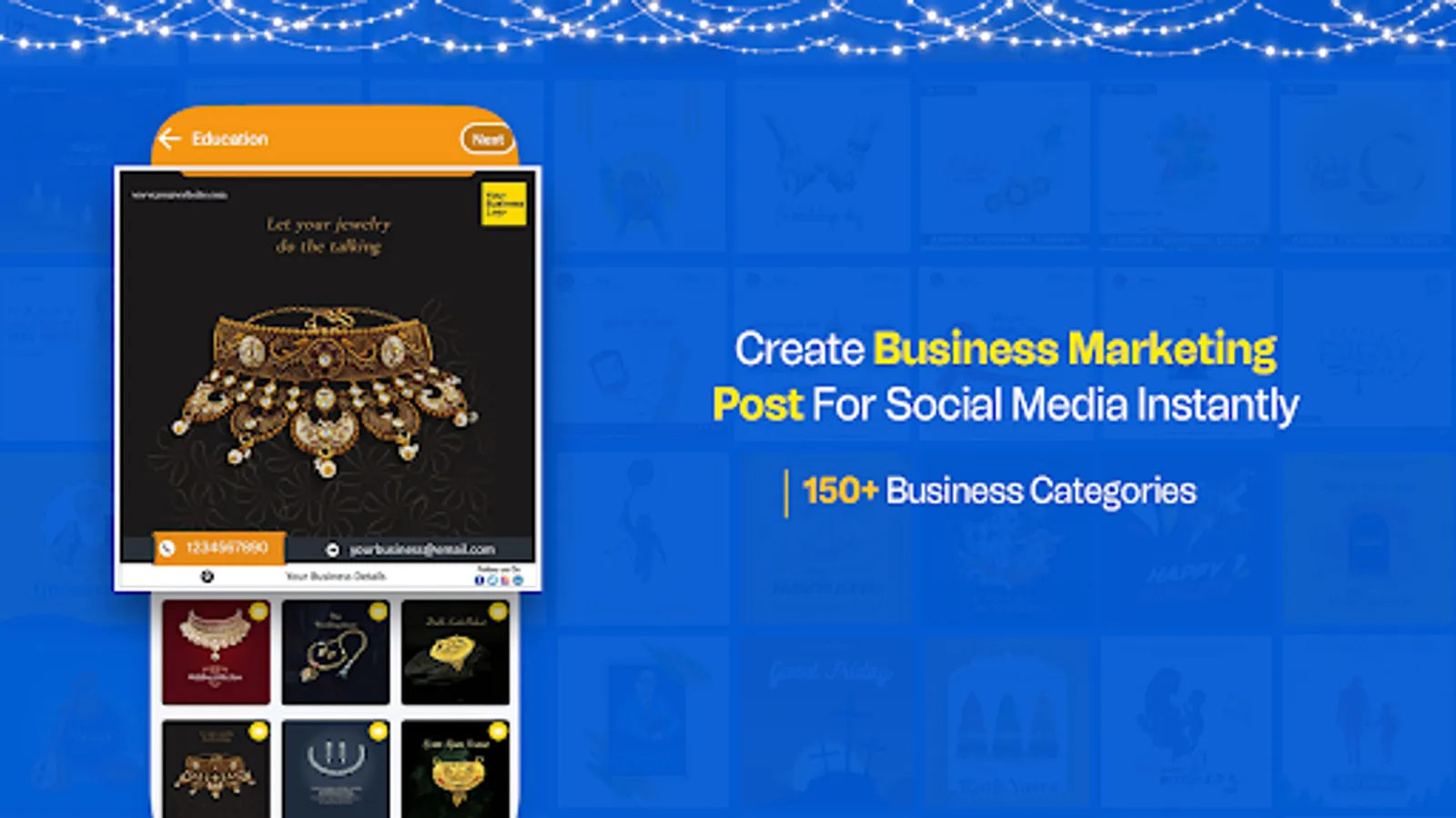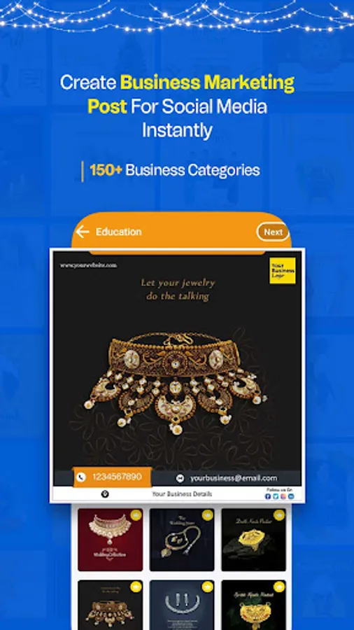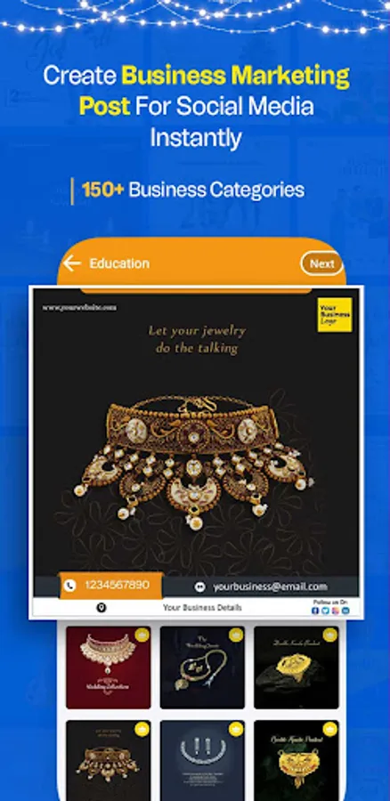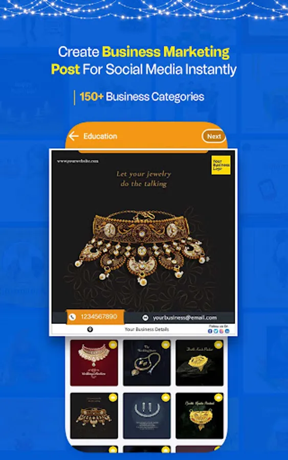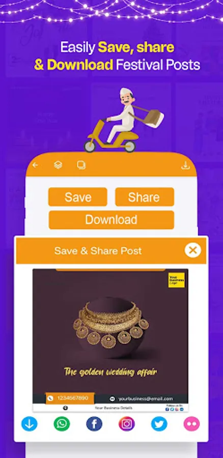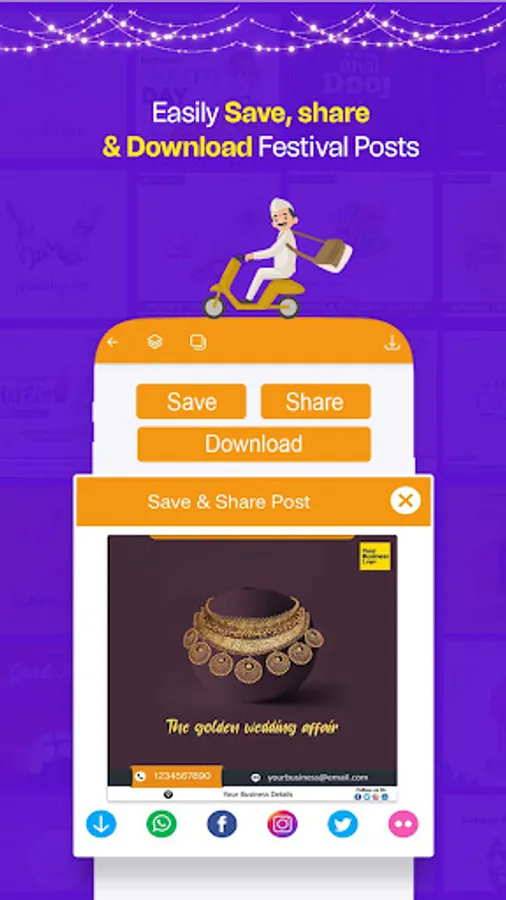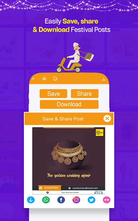 With this Festival Poster Maker app, you can effortlessly save and share eye-catching images or videos, customized with your business logo and company details.