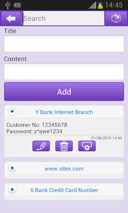 By using Secret Cube, you can keep your secret data with you securely. For example, web site passwords, your credit card numbers, your diary that you don't want anybody to see, work offers etc.