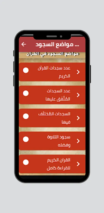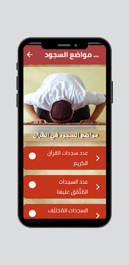 Our application talks about the places of prostration in the Qur’an on the authority of the Malikis, the Shafi’is and the Hanbalis, which are fifteen places and it is obligatory when reading the Holy Qur’an.