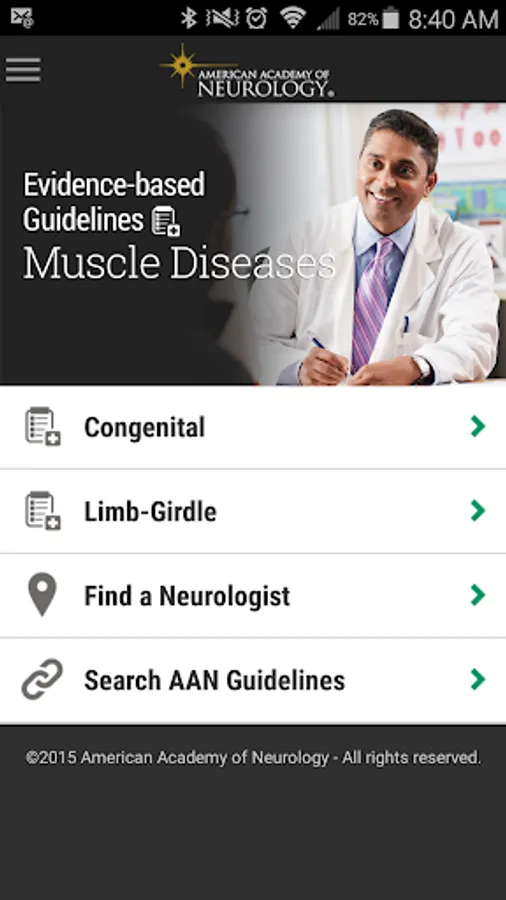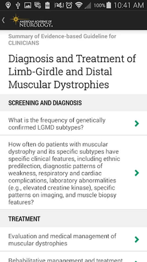 The American Academy of Neurology (AAN), representing more than 28,000 neurologists and neuroscientists worldwide, is the trusted name in evidence-based guidelines for diseases of the brain and central nervous system. The AAN Muscle Disease Guidelines app includes “Diagnosis and Treatment of Limb-Girdle and Distal Dystrophies,” published in the AAN’s leading scientific journal Neurology®. Download the AAN Muscular Disease Guidelines app for iOS/Android.
