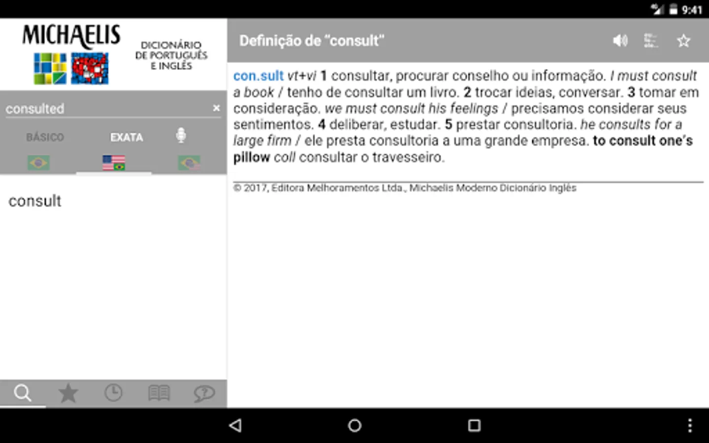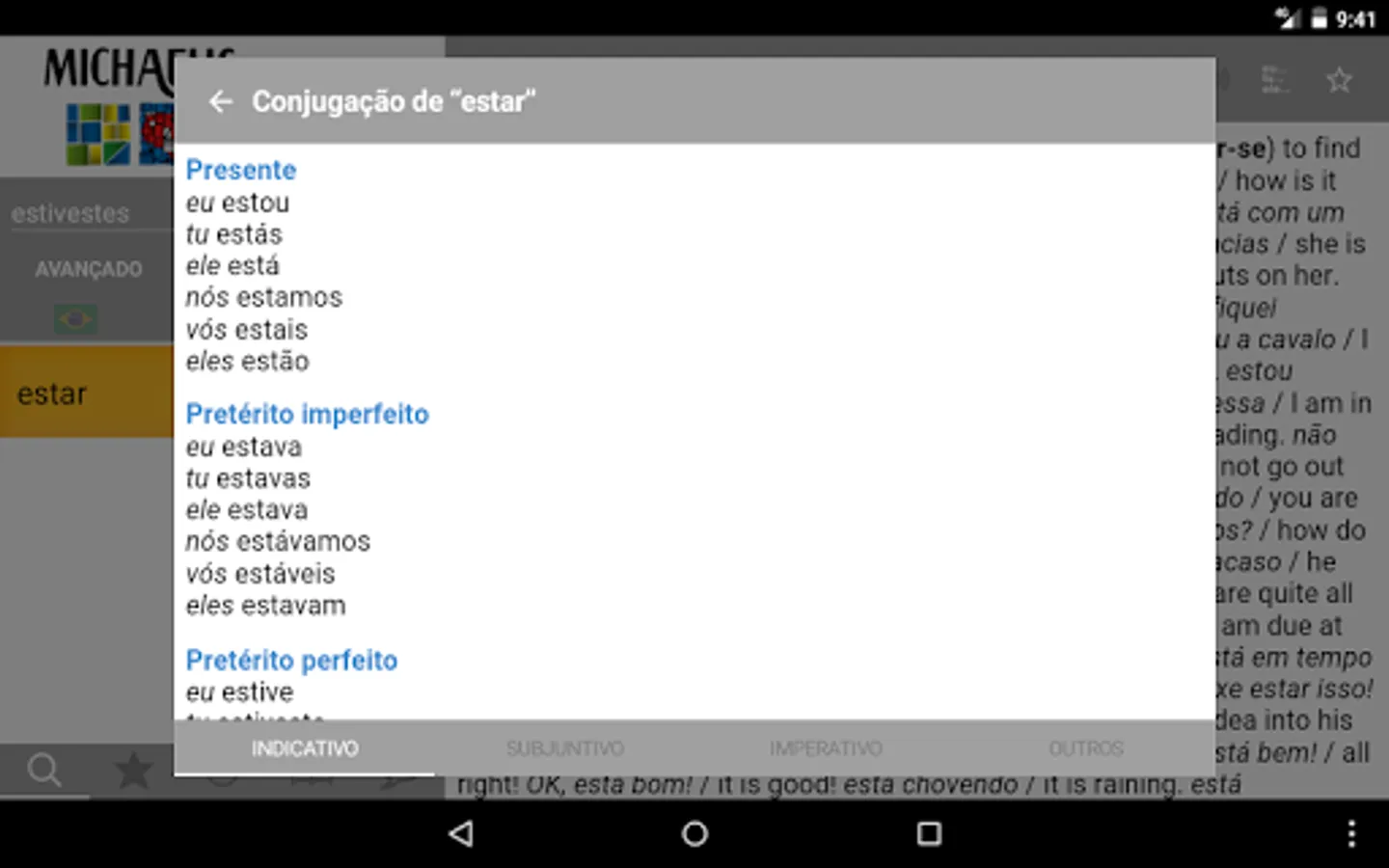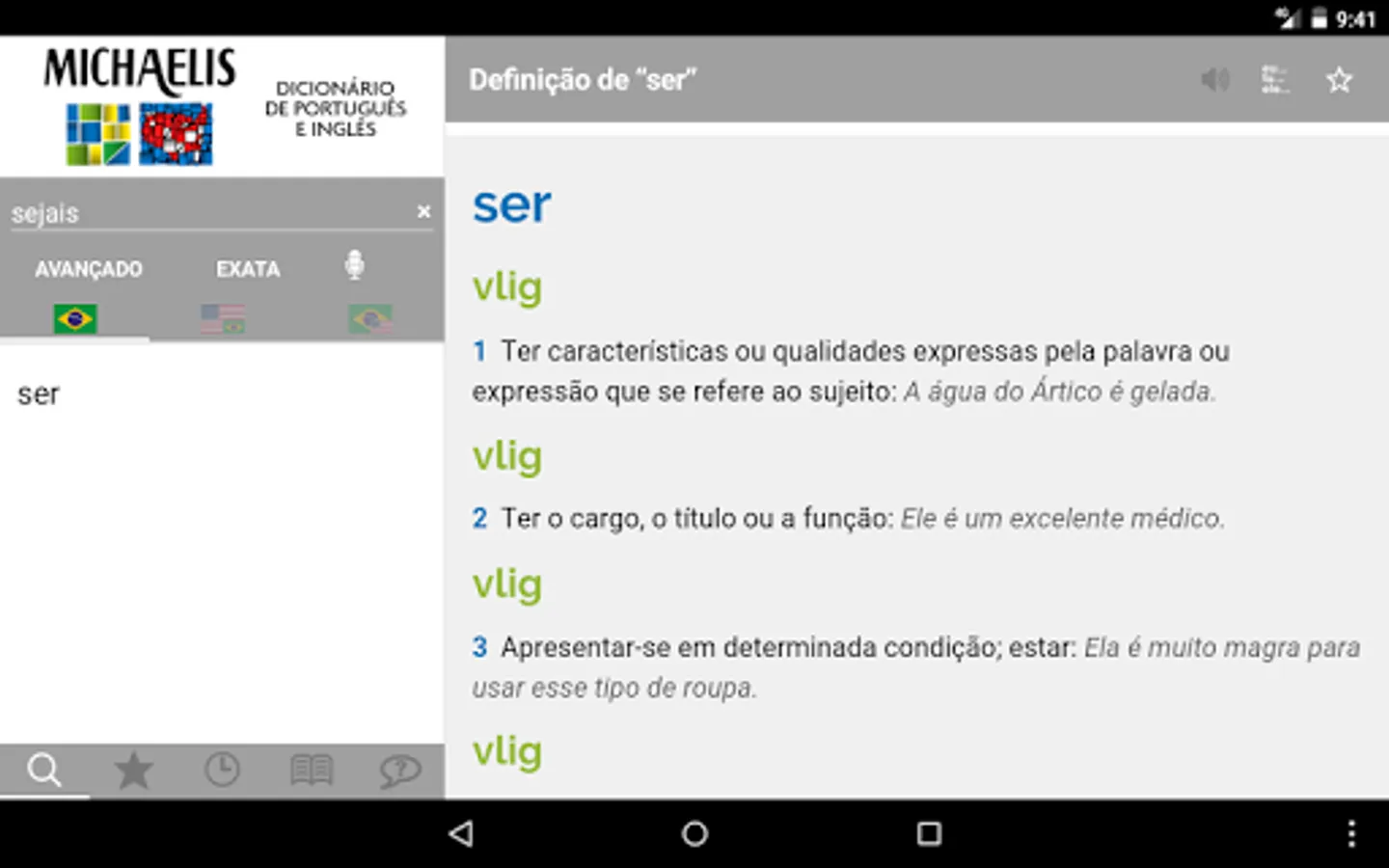 Keep in one application the two dictionaries "offline" most complete of Portuguese and English / Portuguese: the "Michaelis Brazilian Dictionary of the Portuguese Language" and "Michaelis Modern English Dictionary." Together, these dictionaries have over 1 million definitions, translations, expressions and examples.