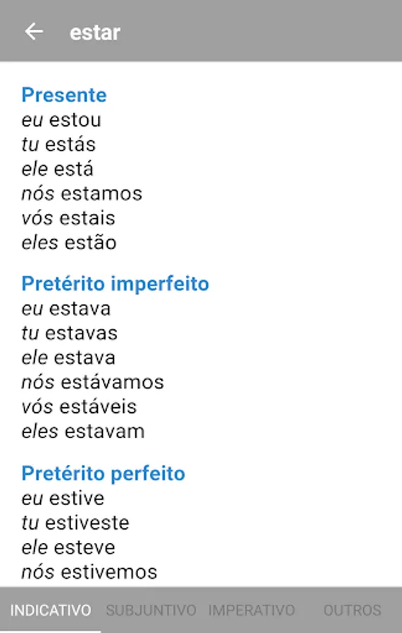 • complete conjugation of all verbs in Portuguese and English dictionary;