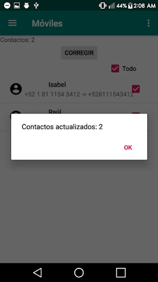 ** Changes are made automatically, to see the changes reflected in your device restart applications that use the information of your contacts (messaging applications) **
