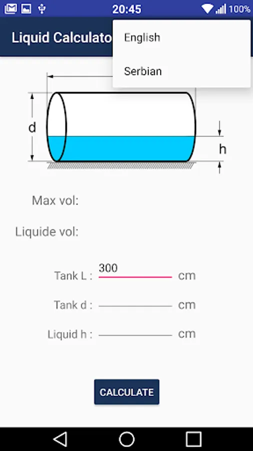 For calculating the amount of liquid in a horizontal cylinder you need to enter following: