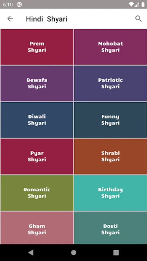 Hindi Shayari is a best android Shayari application which contains 10000+ Shayari on different category like sad Shayari Hindi, attitude Shayari Hindi, romantic Shayari, Birthday Shayari, Funny Shayari, good morning Shayari, good night Shayari,bewafa Shayari, Friendship Shayari, life Shayari, Shayari on Dosti, best Shayari Hindi.