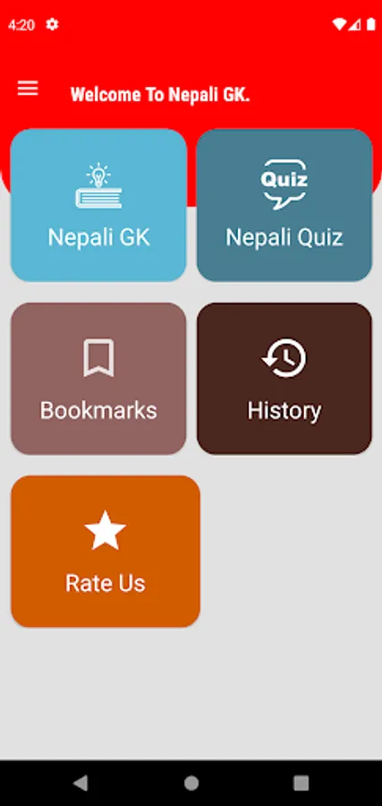 Nepali GK: Nepali Quiz Nepali Samanya Gyan (नेपाली सामान्य ज्ञान) is not at all developed by the Government or any Government agencies. Individuals develop the app. All the materials or contents which are used in this app, have been taken or collected from different people, books, and internet sources we do not own any of them, If you want to remove your content if used in this app, please get in touch with Nepali GK: Nepali Quiz Nepali Samanya Gyan (नेपाली सामान्य ज्ञान) team email address: roshanar.dev@gmail.com.