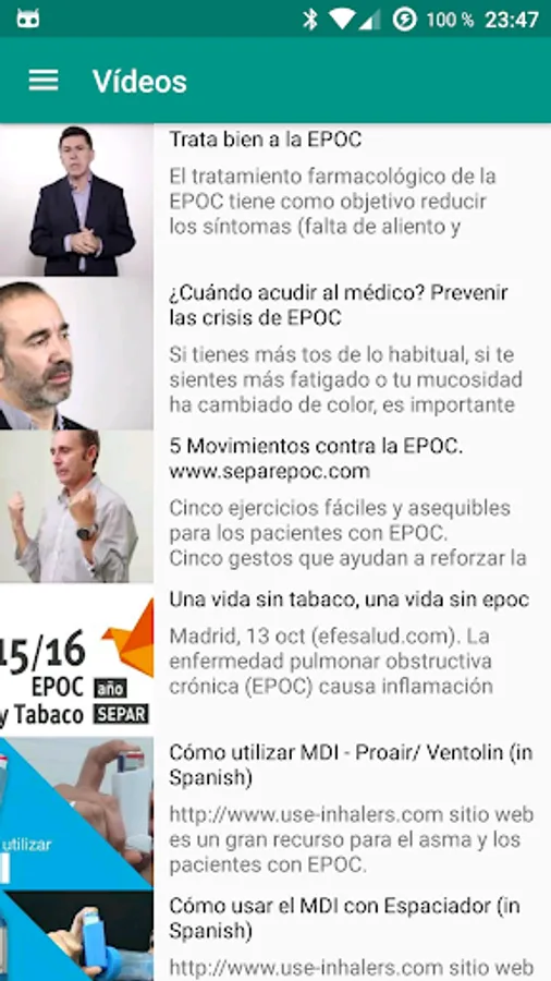 - Videos: Different videos have been selected in which real cases of the daily life of patients with COPD are shown, how to perform the recommended exercises, and how to use inhalers, among others.