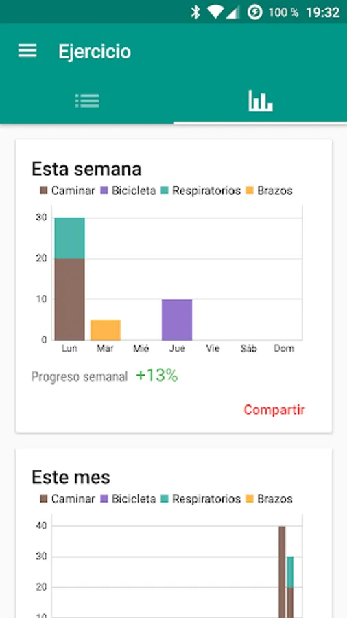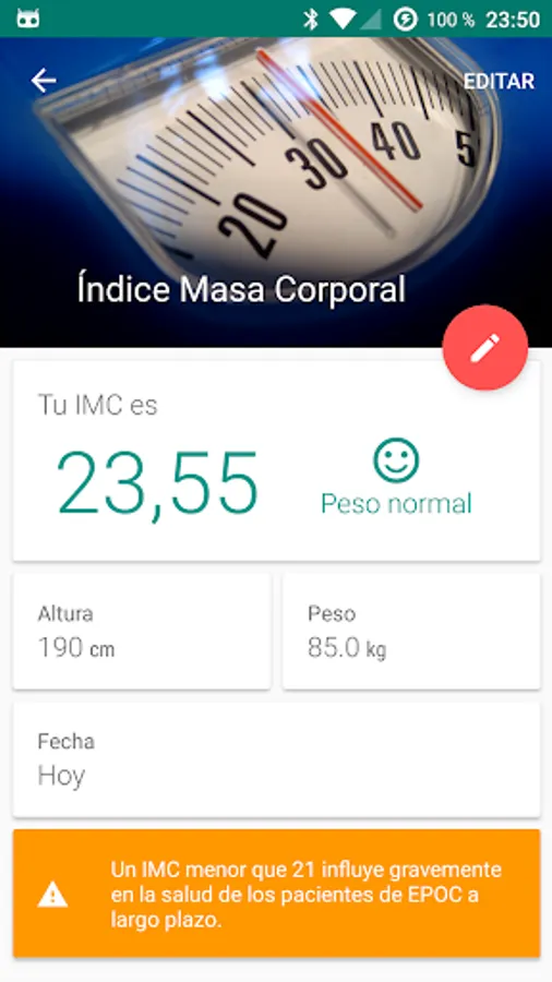 - Registration and total control over fundamental aspects of COPD: The patient can keep a daily record of exacerbations, ordinary medical examinations, body mass index, exercise performed, tobacco, etc. All these data can be viewed comfortably through the weekly, monthly and annual charts integrated in the application, which in turn show progress with respect to the previous week, month or year.